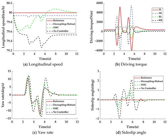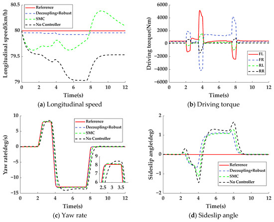 Thus, the coupled nonlinear 3-DOF vehicle system has been decoupled into three independent linear subsystems. The three subsystems, respectively, use the new virtual inputs , , and of the system to independently control the system outputs of longitudinal velocity, yaw rate, and sideslip angle of the center of mass. Each output is not affected by other virtual inputs.