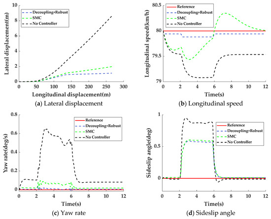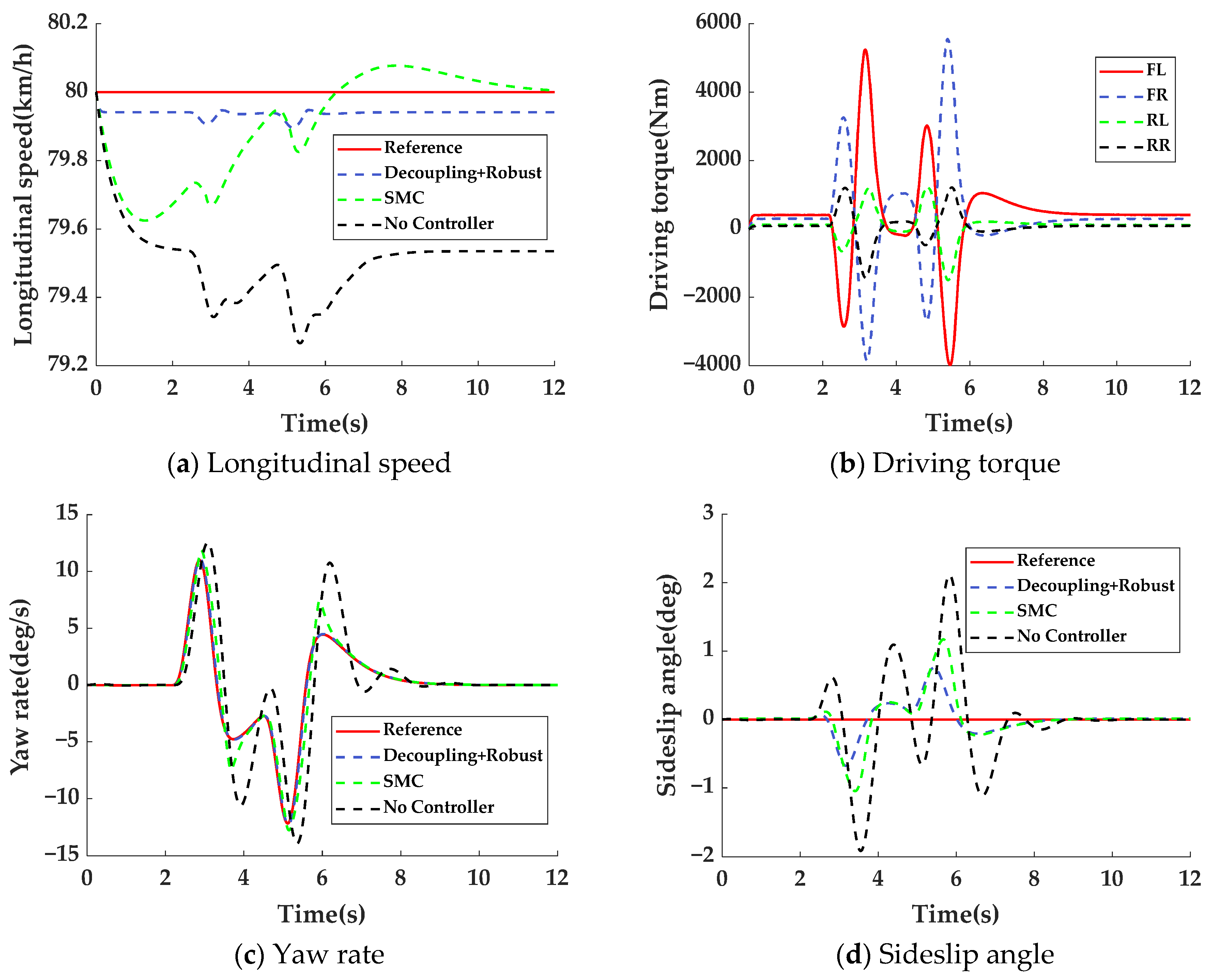 12] implemented independent control of longitudinal, lateral, and yaw motions using a backstepping sliding mode approach, significantly enhancing vehicle lateral stability. Ni et al. [