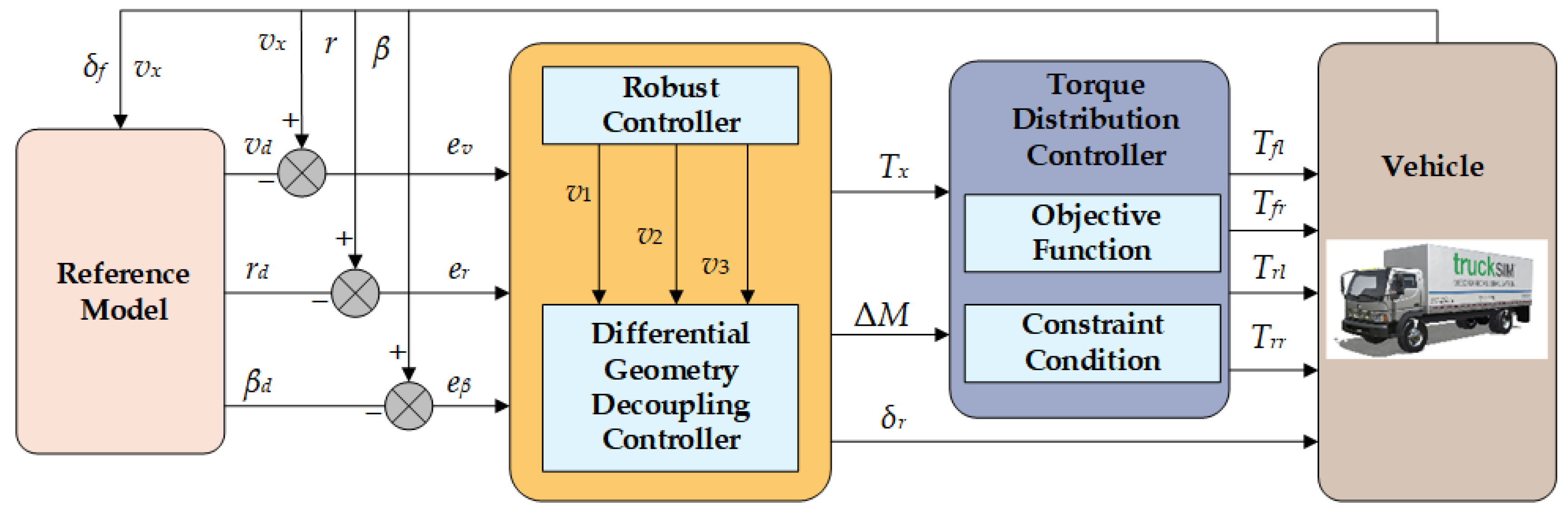 The ideal reference model takes vehicle speed and front-wheel steering angle from the TruckSim driver model as inputs to calculate the desired yaw rate and center-of-mass sideslip angle. The upper-layer robust controller receives deviations between actual vehicle states (speed, sideslip angle, and yaw rate) and their reference values, then computes longitudinal, lateral, and yaw motion control laws through the controller. The middle layer performs differential geometry-based decoupling control, using the control laws from the robust controller as virtual inputs to resolve the 3-DOF nonlinear system into total driver demand torque, rear-wheel steering angle, and additional yaw moment. For torque distribution, the lower layer applies a constrained optimal allocation method to calculate wheel torques based on additional yaw moment and total demand torque. Finally, the rear-wheel steering angle and four-wheel torques are fed back to the TruckSim vehicle model, enabling the three state variables to track the reference model states and achieving stability control.