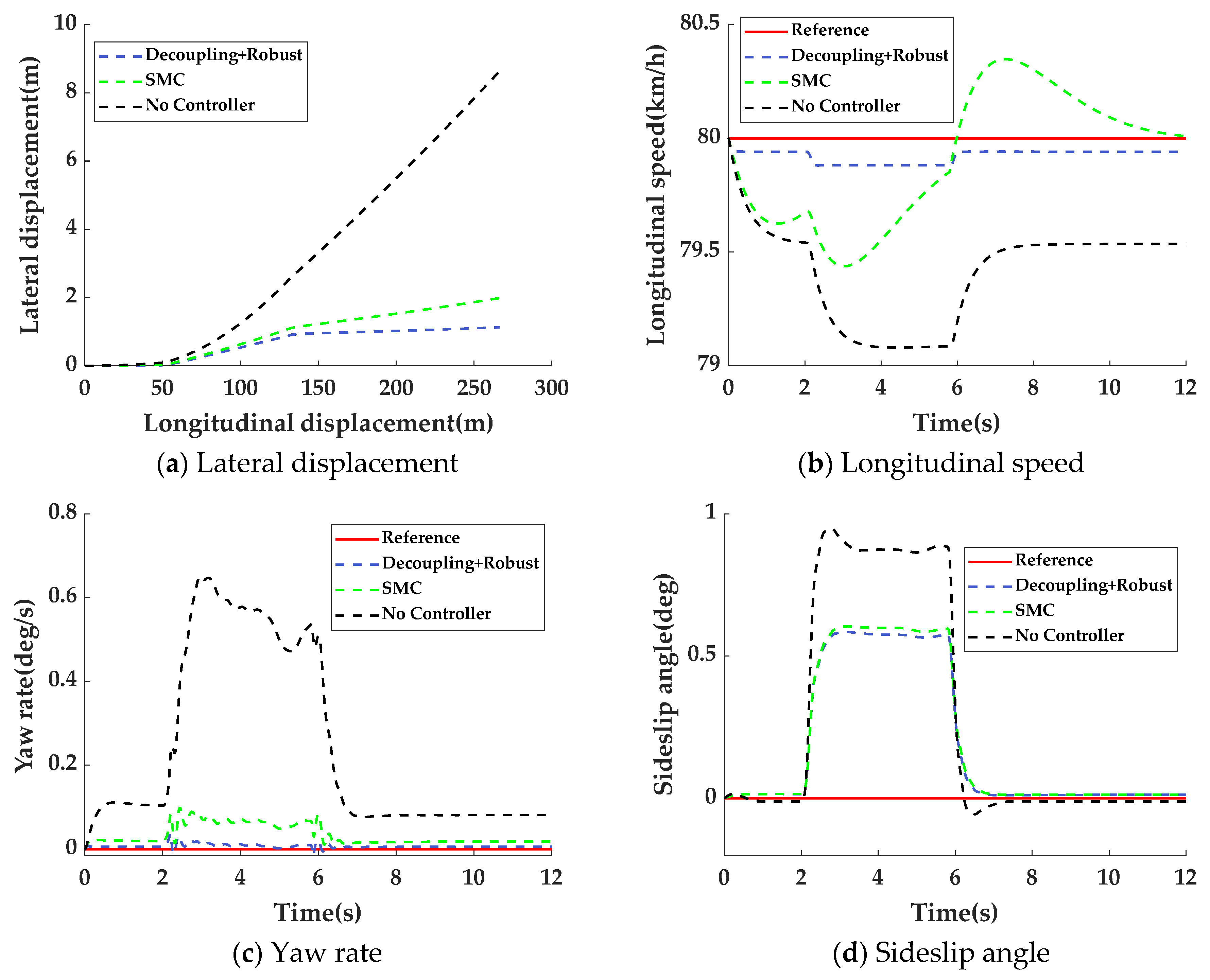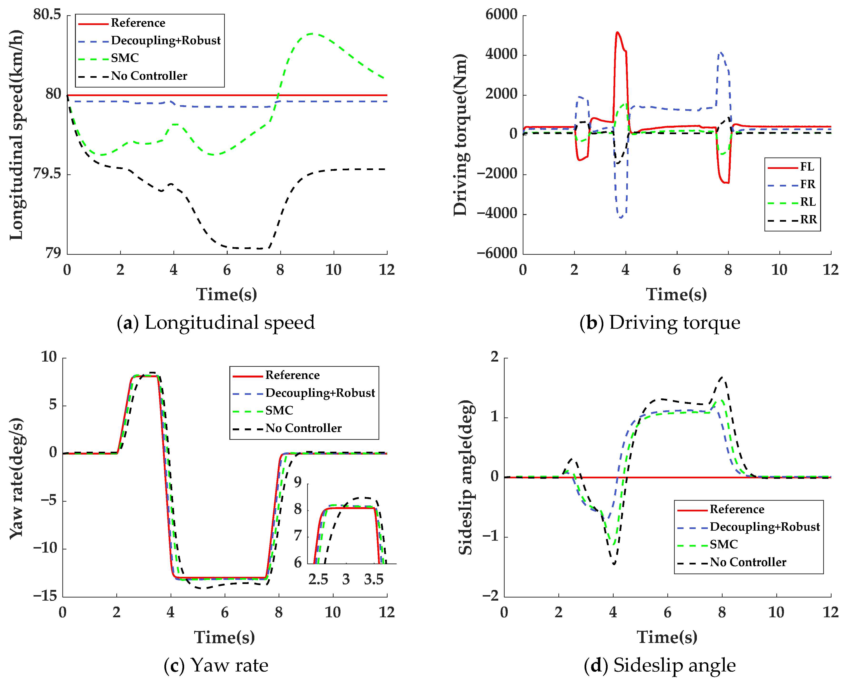 21] applied differential geometry theory to decouple longitudinal-lateral vehicle dynamics, developing a virtual control law with tire cornering stiffness estimation that enhanced intelligent vehicle path-tracking. However, this method exhibited insufficient precision in yaw rate control.