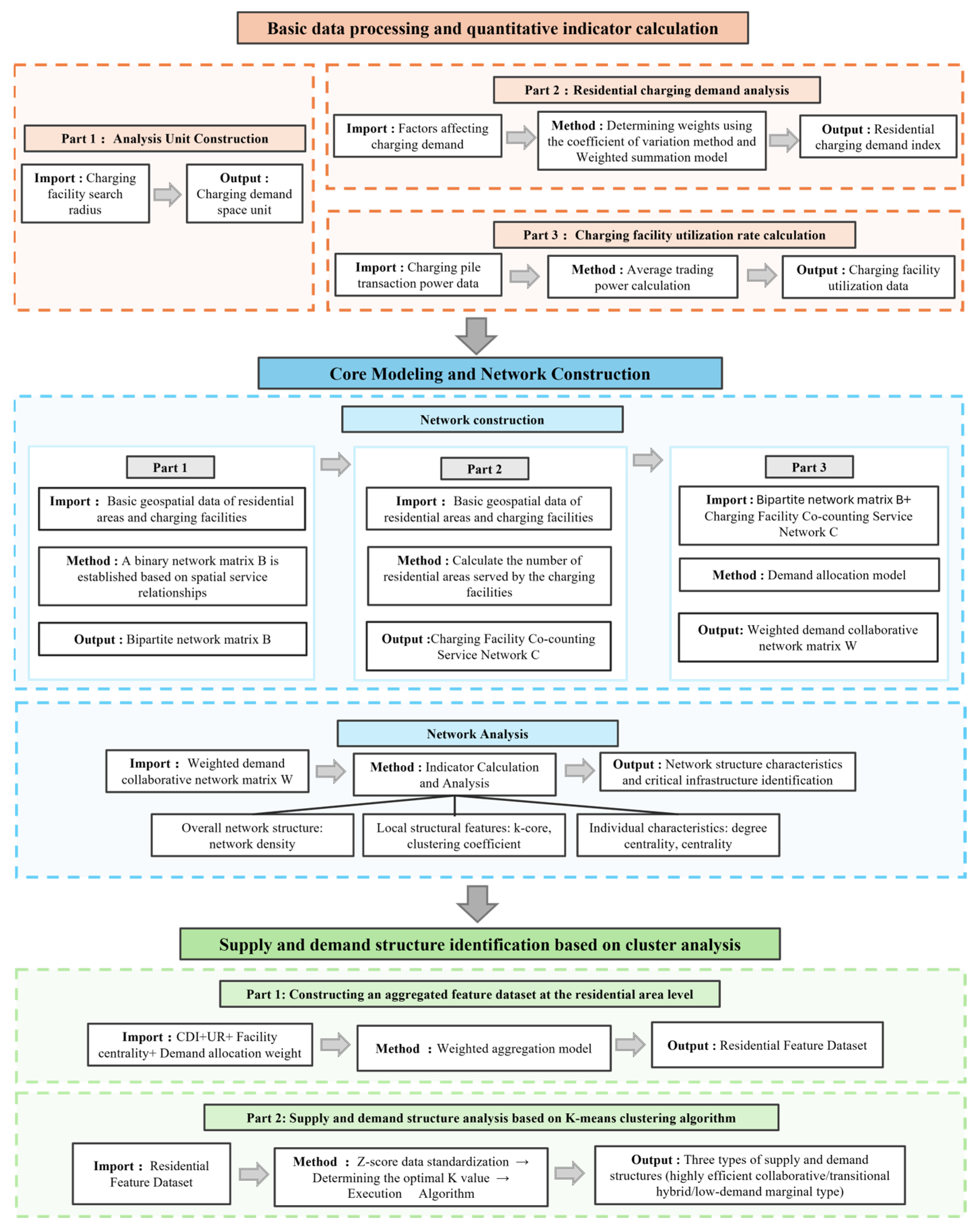 Figure 2). First, the spatial representation of demand and supply is achieved by quantifying residential charging demand and analyzing the utilization rate of charging facilities. Next, a collaborative service network is constructed, and its topological indicators are calculated to systematically evaluate the collaborative supply capability of the facilities from the overall, local, and node levels. Finally, based on this, a dataset is constructed by integrating demand, utilization rate, and network structure characteristics, and K-means clustering is used to identify differentiated supply and demand structure types, providing scientific basis for proposing precise and differentiated optimization strategies.