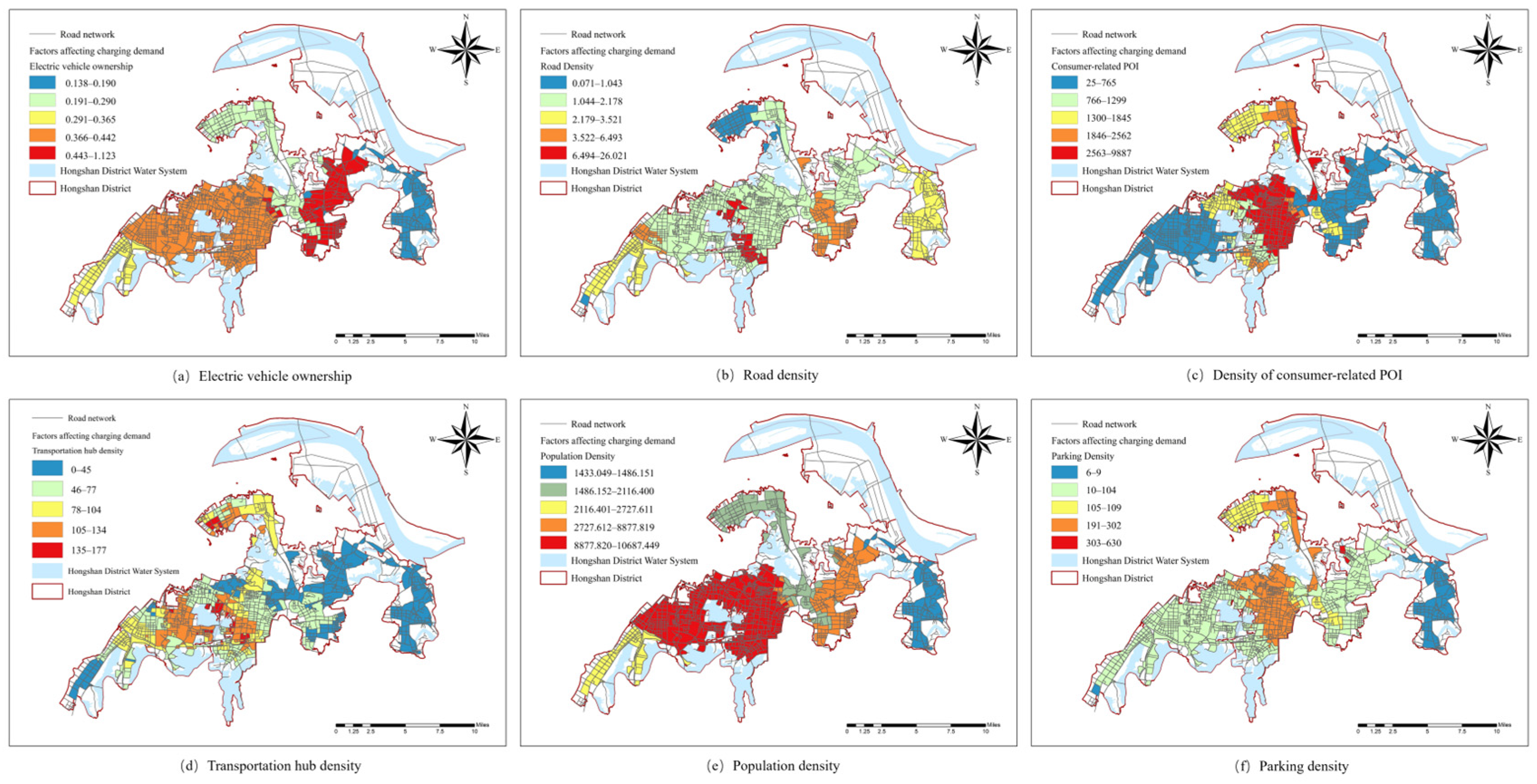 Factors affecting charging demand. (a) Electric vehicle ownership. (b) Road density. (c) Density of consumer-related POI. (d) Transportation hub density. (e) Population density. (f) Parking density.