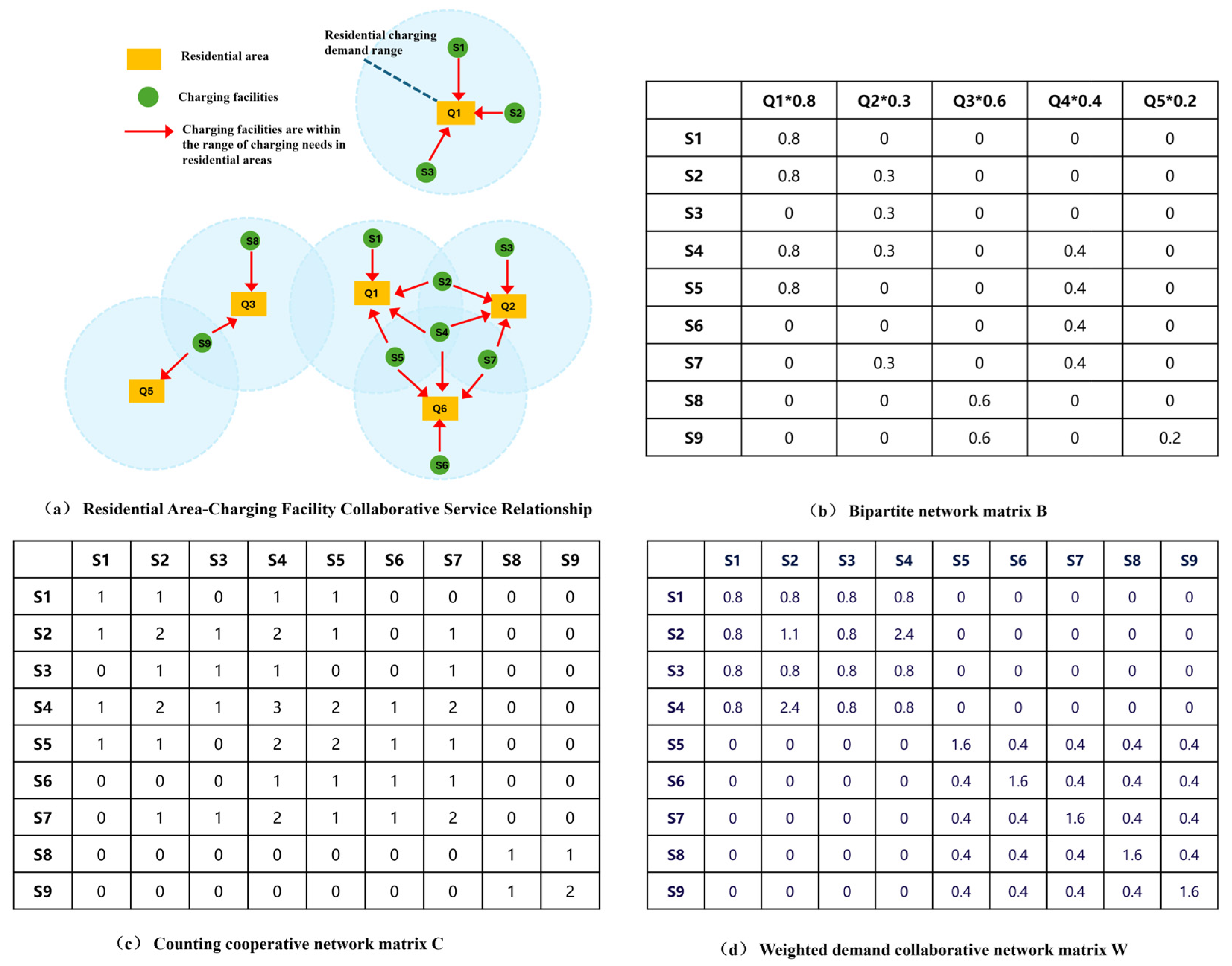 Construction of the Residential Area–Charging Facility Collaborative Service Network. (a) Residential Area-Charging Facility Collaborative Service Relationship. (b) Bipartite network matrix B: Q1*0.8 means that the charging demand of residential area Q1 is 0.8. (c) Counting cooperative network matrix C. (d) Weighted demand collaborative network matrix W.