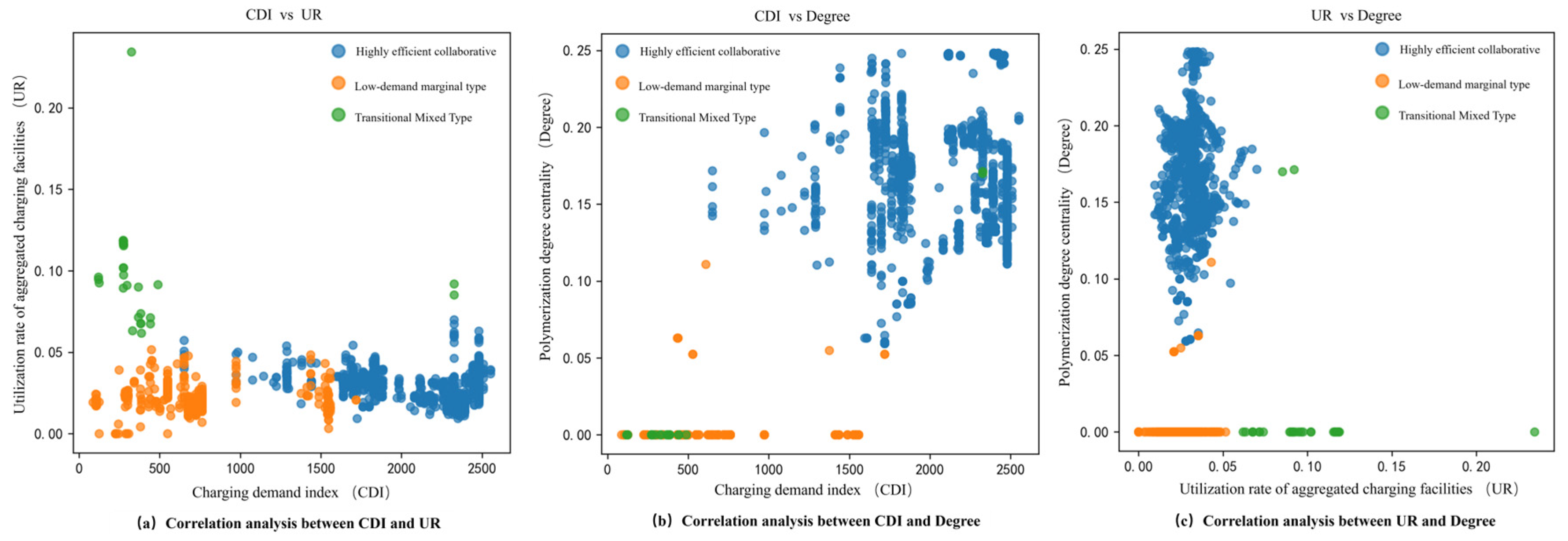 (2) By combining the utilization of existing charging facilities with their collaborative service capabilities, the study employs cluster analysis to summarize the supply–demand balance status of residential area charging facilities. It identifies three different supply–demand structure types and proposes targeted construction strategies, offering valuable reference for the guidance of charging facility development and enriching the research methodology for charging infrastructure construction.
