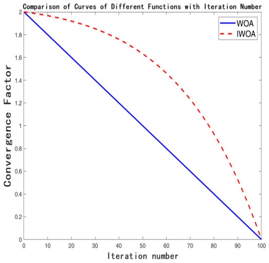 In the algorithm’s search process, the vector coefficient determines whether to search for solutions beyond the optimal one, preventing trapping in local optima. The magnitude of the convergence factor dictates the size of [18]. The larger is, the larger the coefficient is, and the smaller is, the smaller the coefficient is. When , the algorithm tends to conduct global exploration, guiding whale individuals away from the currently known optimal position to search a broader solution space. This helps discover new and potentially better regions, avoiding premature convergence to local optima. When , the algorithm enters exploitation mode [19], which is more biased towards local development, allowing individual whales to conduct a refined search around the currently found better solution, continuously optimizing existing solutions and mining solutions corresponding to better fitness values in the area, thereby improving convergence accuracy. Therefore, to ensure the algorithm can better escape local optima, the decrease of can be appropriately slowed to extend the global search duration. Based on this idea, introducing a nonlinear convergence factor is a feasible approach. The comparison of the convergence factors before and after improvement is shown in Figure 1. The mathematical formula for the improved convergence factor is as follows: