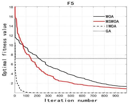 Five test functions from the cec2005 test function set were selected, MATLAB R2024a was used to test the performance of IWOA, and comparative analysis was conducted with the traditional whale optimization algorithm (WOA), the algorithm in Ref. [15] (MSWOA), and the genetic algorithm (GA). The mathematical expression and optimal value of the test function are shown in Table 1. In this table, F1 is the sphere function, F2 is Schwefel’s problem 2.21, F3 is the Rosenbrock function, F4 is the Rastrigin function, and F5 is the Griewank function. In this test, the number of algorithm populations is 30, the dimension is 30, the number of tests is 10, and the maximum number of iterations is 1000. The test results are shown in Table 2, and the fitness and iteration number curve is shown in Figure 3, Figure 4, Figure 5, Figure 6 and Figure 7.