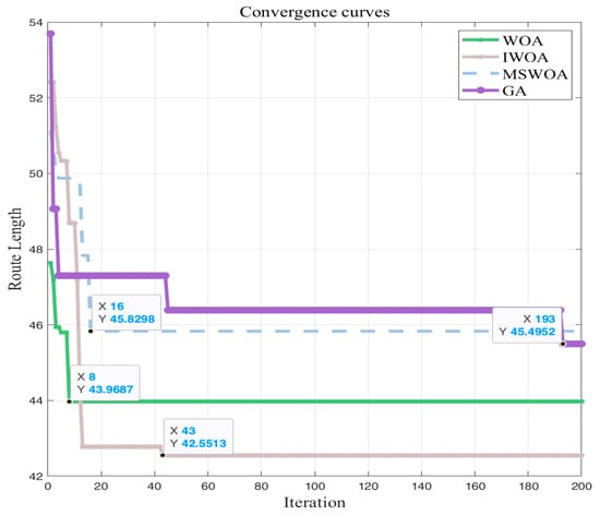 It can be seen from Table 3 that in the 30 × 30 map, compared with the three algorithms of the WOA, MSWOA, and GA, the IWOA shortened the path length by 3.23%, 7.16%, and 6.49%, respectively. In a 50 × 50 map, compared with the WOA, MSWOA, and GA, the IWOA shortened the path length by 4.88%, 4.53%, and 28.37%, respectively, and had obvious advantages in the number of iterations and the number of inflection points. Therefore, the feasibility of the IWOA in path planning is proven. As can be seen from Figure 8 and Figure 9, although the IWOA has more iterations in the simulation, it has advantages in terms of path length and smoothness. This shows that although the nonlinear convergence factor used by the IWOA increases the random search time of the algorithm, it is able to find better optimal solutions and avoid falling into local optima, which proves the feasibility of the improved algorithm.