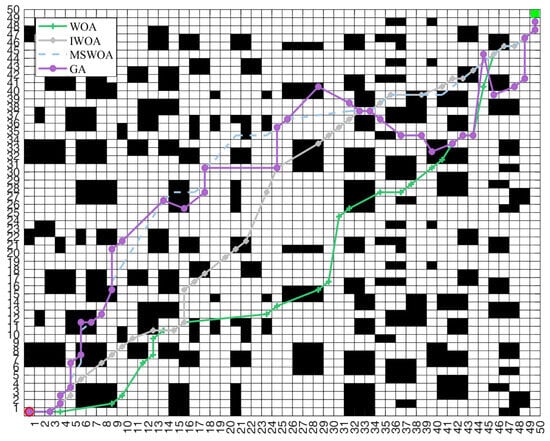 We set the starting point and ending point on the map; observed and compared the length of the journey to the ending point and the number of turning points of the traditional whale optimization algorithm (WOA), the reference [15] algorithm (MSWOA), the genetic algorithm (GA), and the improved whale optimization algorithm (IWOA) on different maps; and analyzed the feasibility of the improved whale optimization algorithm (IWOA) in path planning.