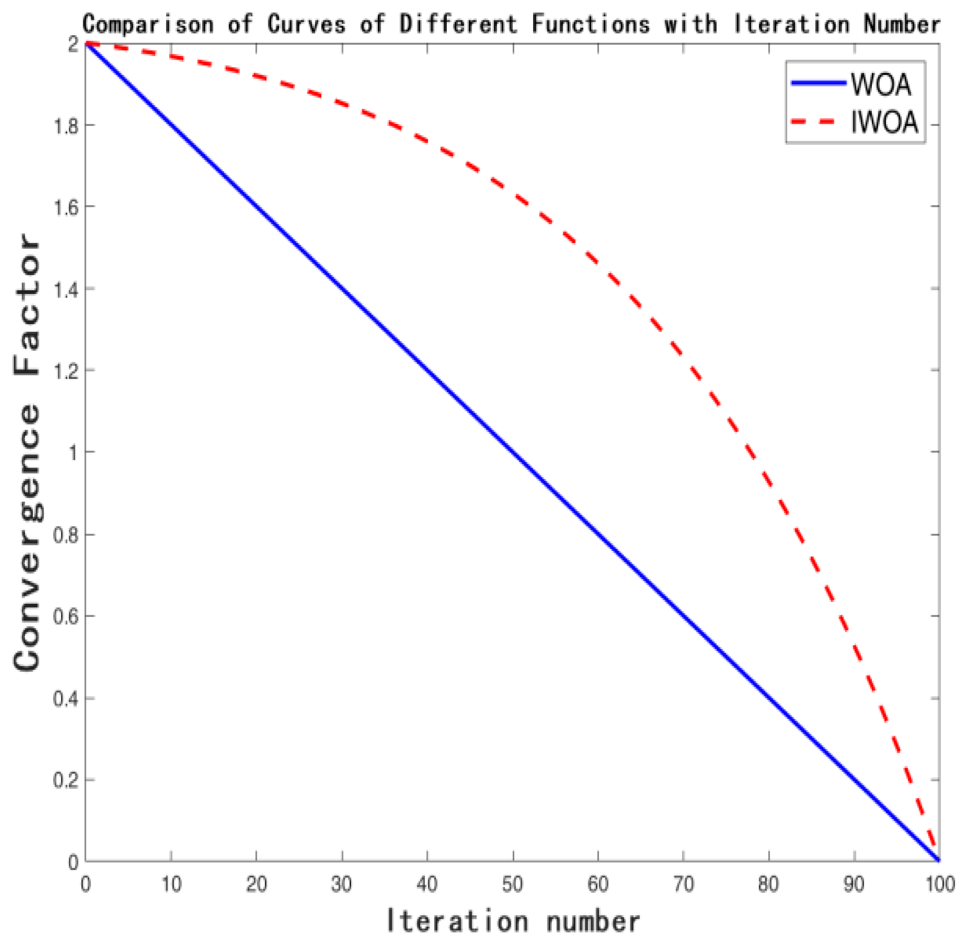 In the algorithm’s search process, the vector coefficient A determines whether to search for solutions beyond the optimal one, preventing trapping in local optima. The magnitude of the convergence factor a dictates the size of A [18]. The larger a is, the larger the coefficient A is, and the smaller a is, the smaller the coefficient A is. When A > 1 , the algorithm tends to conduct global exploration, guiding whale individuals away from the currently known optimal position to search a broader solution space. This helps discover new and potentially better regions, avoiding premature convergence to local optima. When A 1 , the algorithm enters exploitation mode [19], which is more biased towards local development, allowing individual whales to conduct a refined search around the currently found better solution, continuously optimizing existing solutions and mining solutions corresponding to better fitness values in the area, thereby improving convergence accuracy. Therefore, to ensure the algorithm can better escape local optima, the decrease of A can be appropriately slowed to extend the global search duration. Based on this idea, introducing a nonlinear convergence factor is a feasible approach. The comparison of the convergence factors before and after improvement is shown in Figure 1. The mathematical formula for the improved convergence factor is as follows: