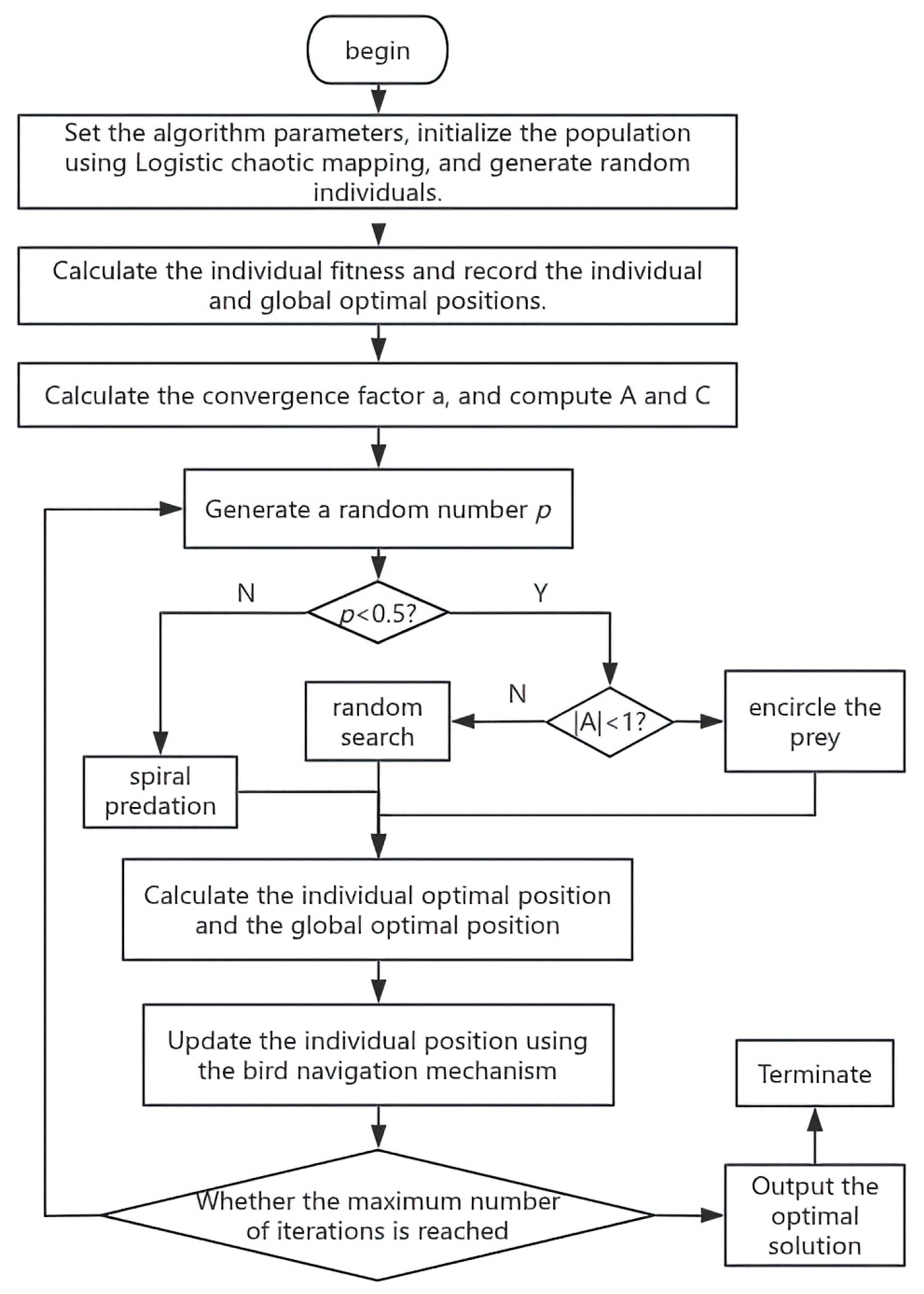 In view of the WOA’s problems, such as insufficient initial population quality, linear decline in convergence factors leading to local optima, and fixed spiral parameters affecting search diversity, this paper makes improvements in four aspects: using logistic chaos mapping to initialize the population; designing nonlinear convergence factors; introducing adaptive spiral shape constants; and integrating bird navigation mechanisms to improve stability.