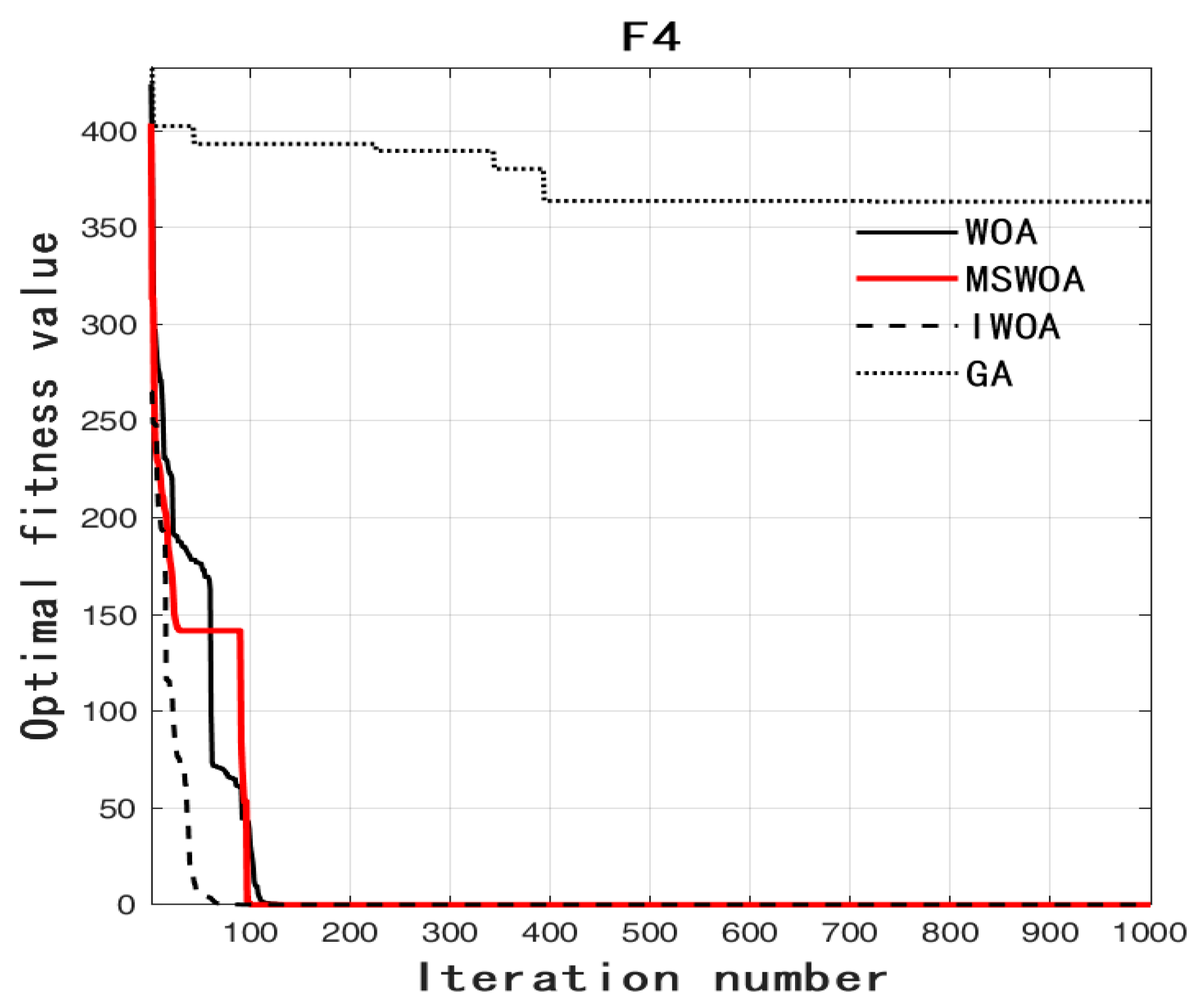 As can be seen from Figure 3, Figure 4, Figure 5, Figure 6 and Figure 7, no matter which test function it is, the IWOA can basically find the optimal solution. In particular, when the test functions are F2, F4, and F5, the effect is more obvious. When the test functions are F2, F4, and F5, one can see that the IWOA can find the optimal solution at the early stage of iteration. From the average value shown in Table 2, one can also see that the IWOA can find the optimal solution in every test, and its performance is stable. This shows that the IWOA uses adaptive spiral parameters to expand the search range in the early iteration so that the optimal solution is found faster; secondly, the IWOA makes its performance more stable by integrating the bird navigation mechanism.