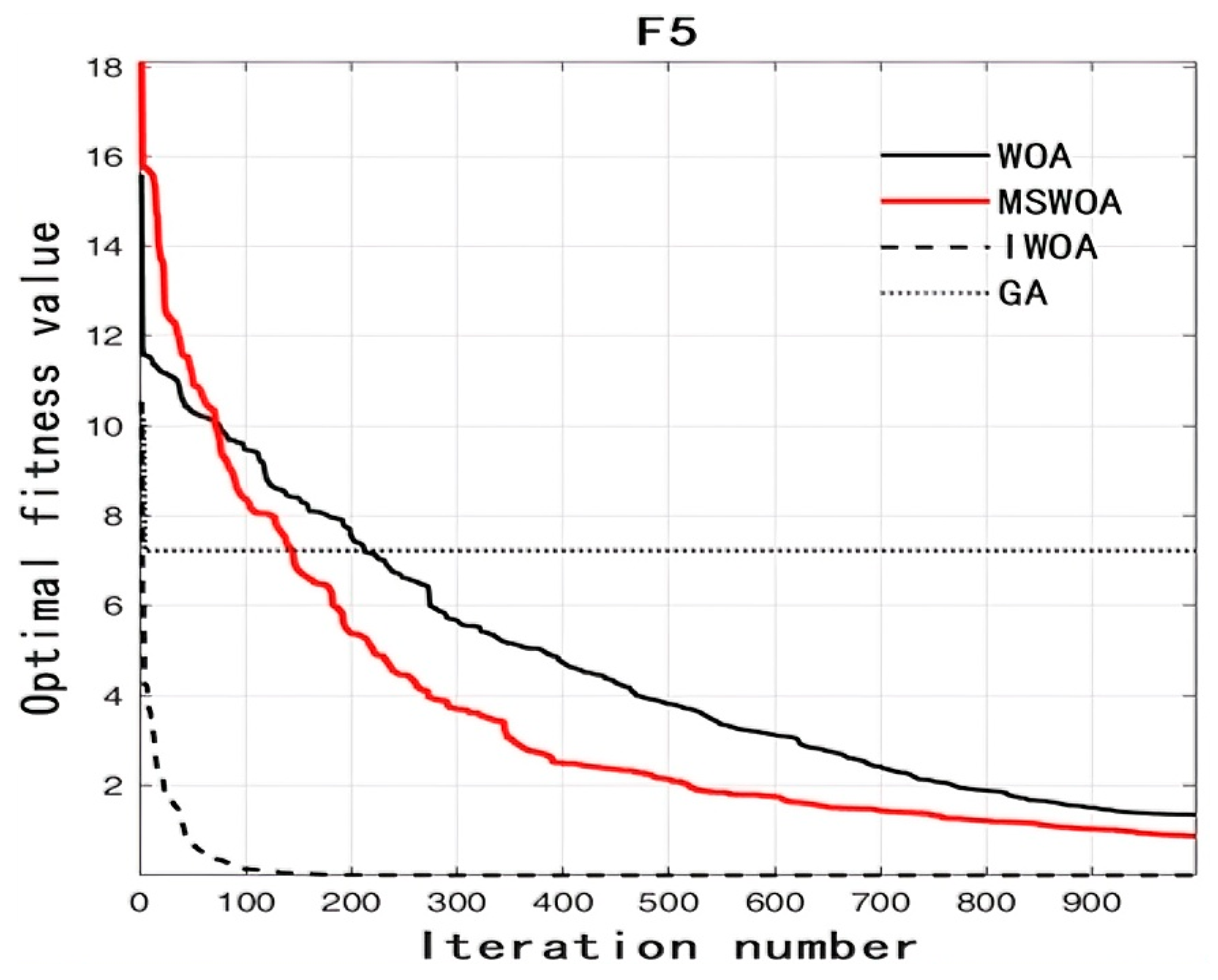 Figure 7. Fitness curve vs. iteration number of function F5.