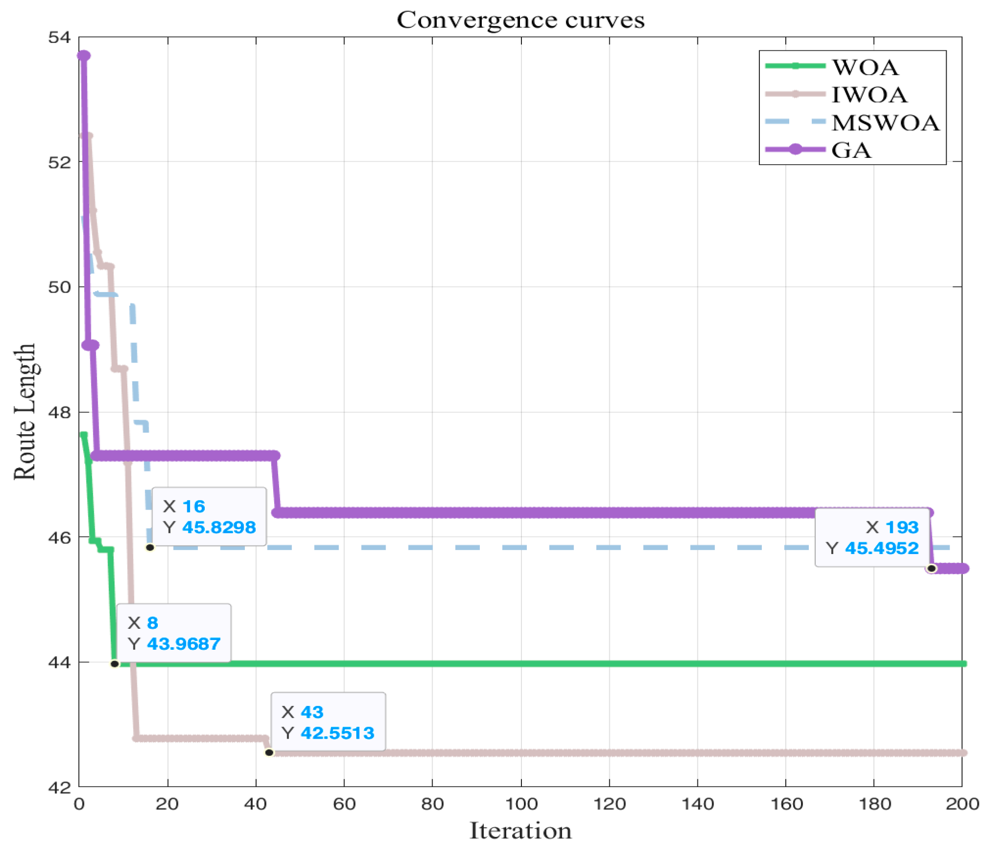 Figure 9. Comparison of iteration curves of four algorithms on 50 × 50 maps.