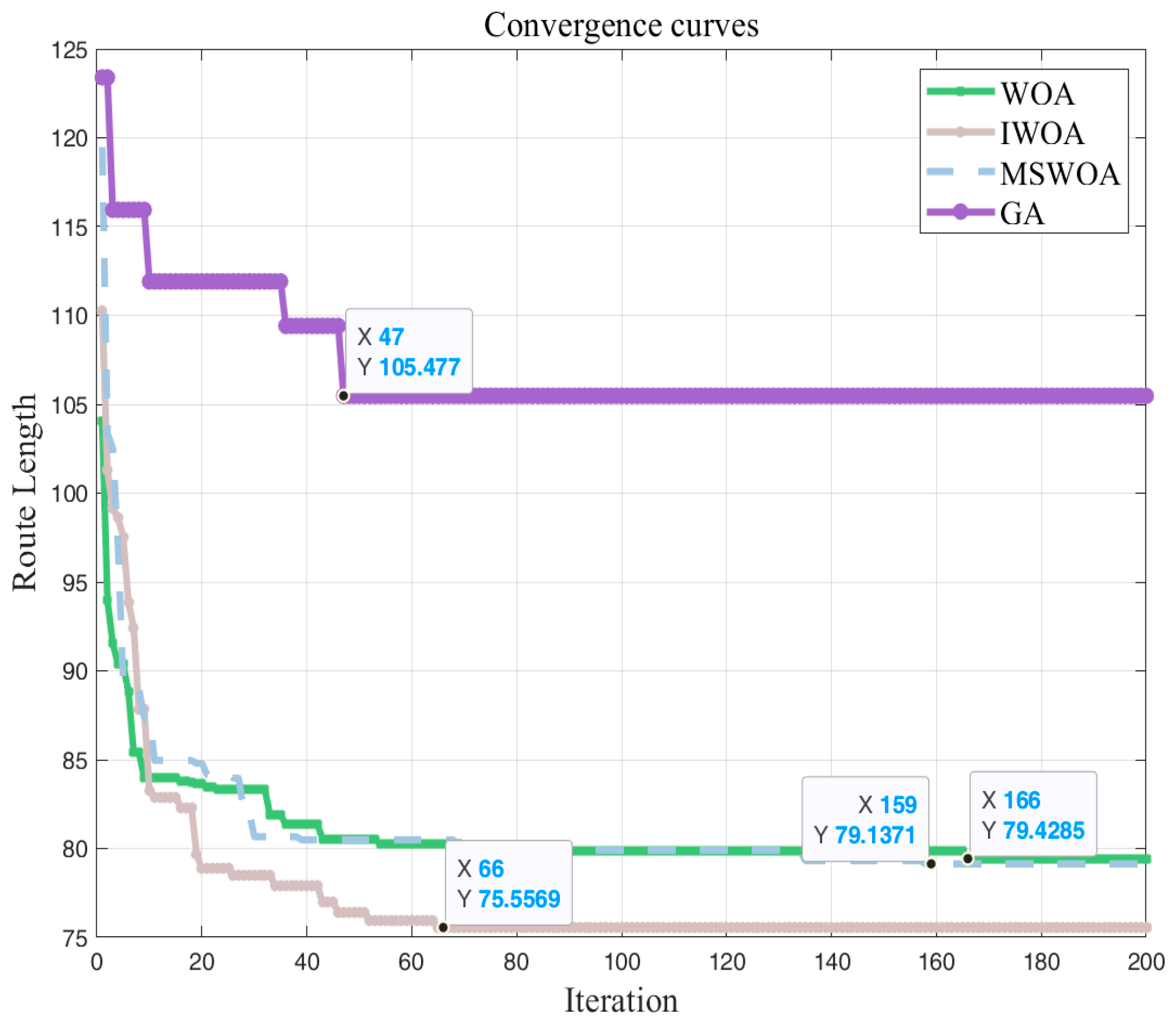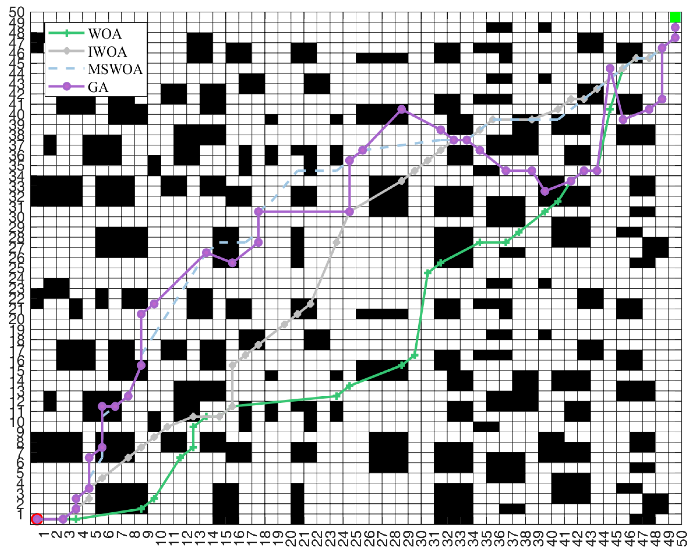 Intelligent path planning algorithms have become a research hotspot in this field due to their advantages of strong global search capabilities, wide adaptability, and their lack of a requirement to rely on accurate environmental models. Among them, the particle swarm optimization algorithm (PSO) [1] simulates the foraging behavior of a flock of birds and achieves optimal solution searching through individual collaboration. It has the characteristics of fast convergence and simple principles, but it is easy to fall into local optimality in the later stages of iteration. The genetic algorithm (GA) [7] is based on the theory of biological evolution and achieves population evolution through selection, crossover, and mutation operations. It is highly robust but has high computational complexity and limited adaptability to high-dimensional environments. The whale optimization algorithm (WOA) [8] is a new intelligent optimization algorithm proposed in 2016. Inspired by the group hunting behavior of humpback whales in nature, it has the unique advantages of simple structure, few optimization parameters, and strong global search capabilities. In recent years, its application in the field of path planning has gradually attracted attention.