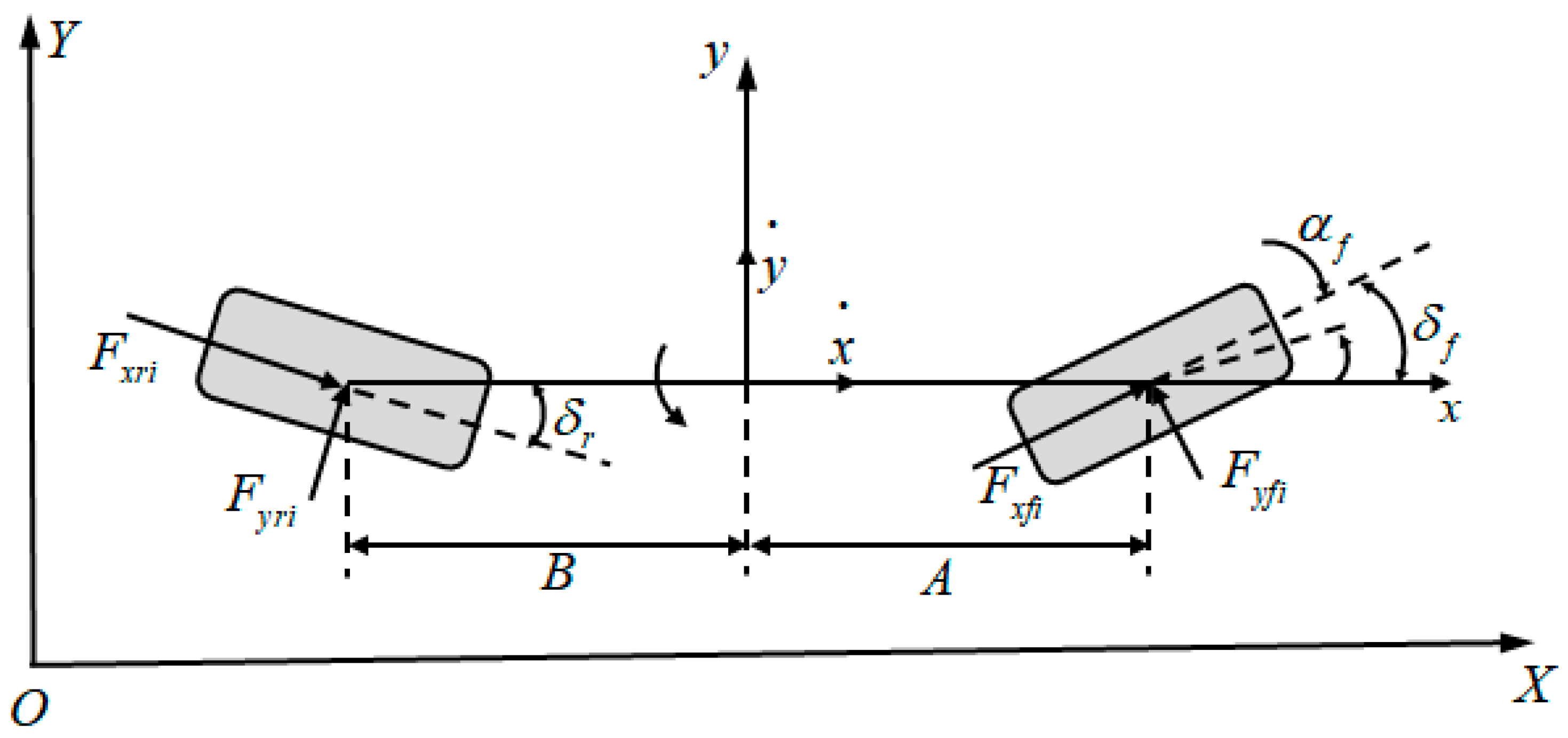 According to the coordinate system, the lateral deviation angles of the front and rear wheels can be expressed as follows: