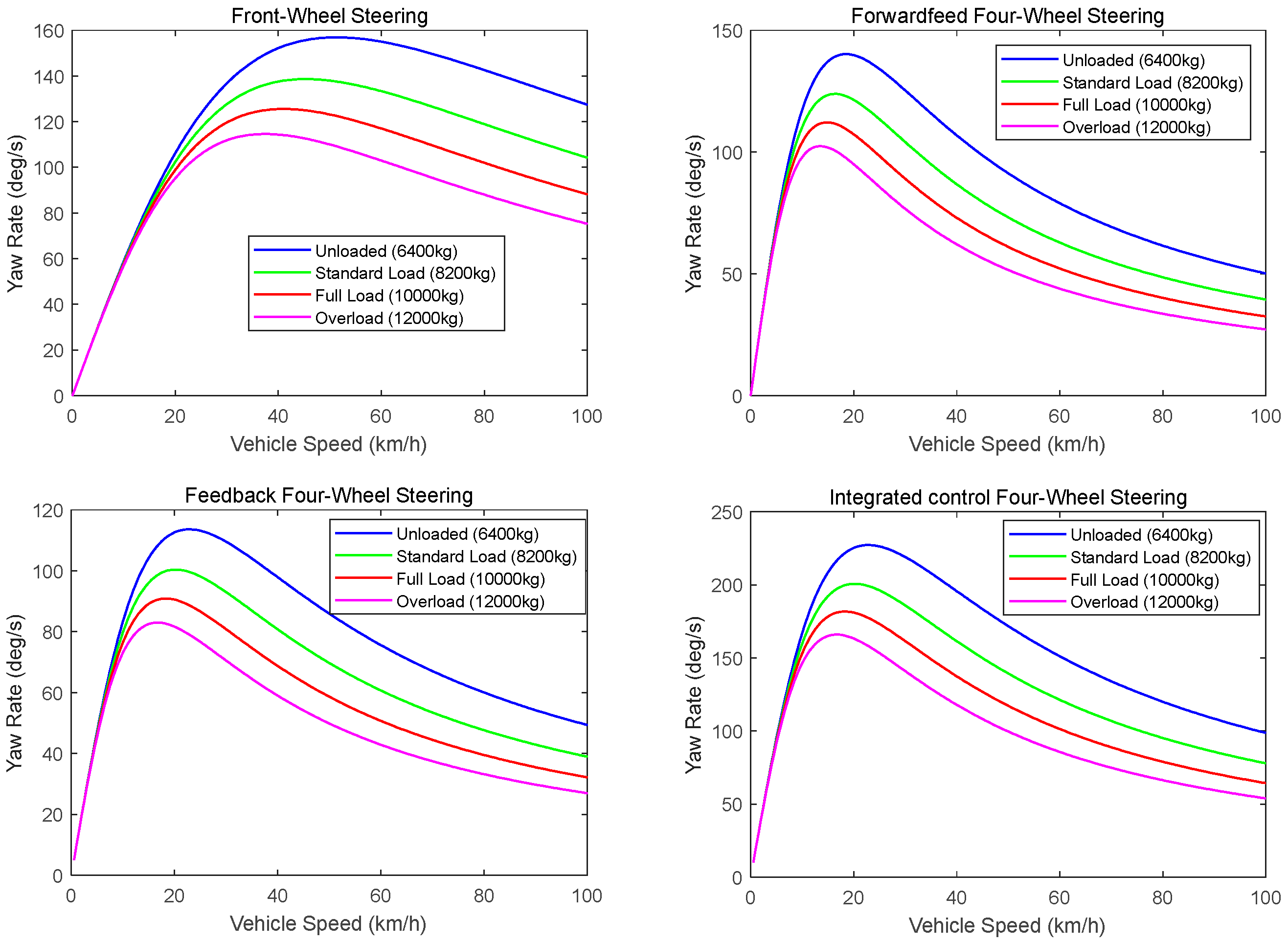 5]. Nagia et al. found that 4WS not only improves a vehicle’s low-speed maneuverability and high-speed stability but also actively adjusts the load distribution between its inner and outer wheels, thereby enhancing active safety controls under extreme driving conditions [