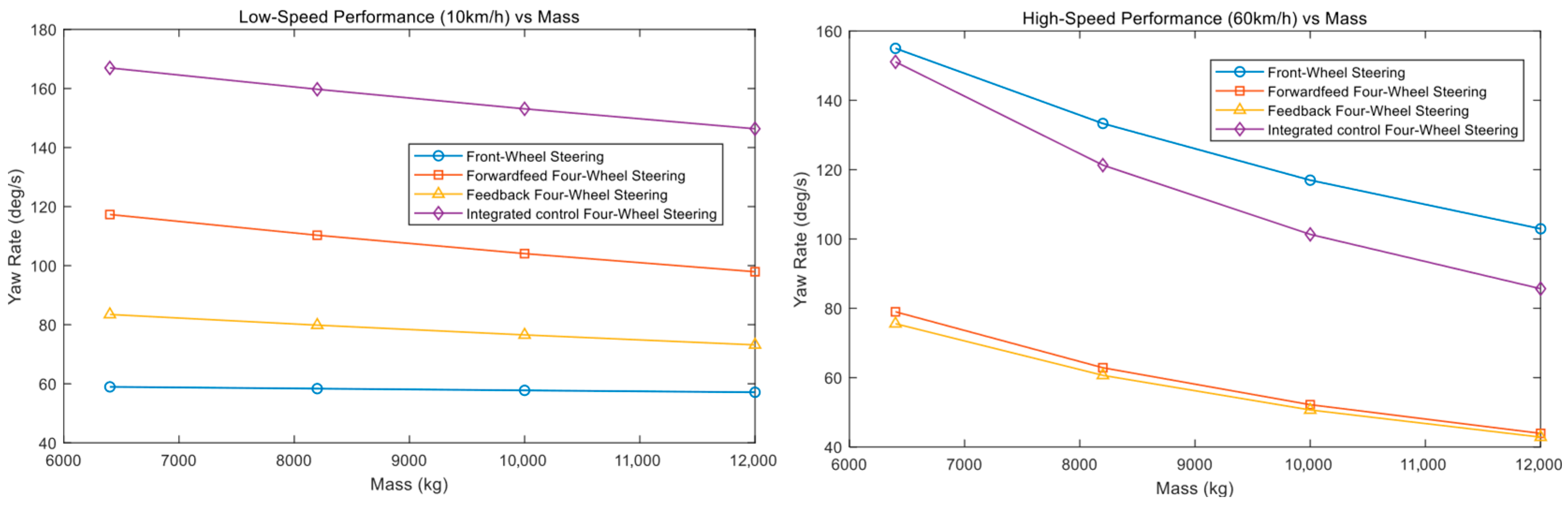 13]; Ye et al. employed a robust H∞ control approach, which not only enhanced the disturbance rejection capability of the active 4WS system but also improved its active safety performance [