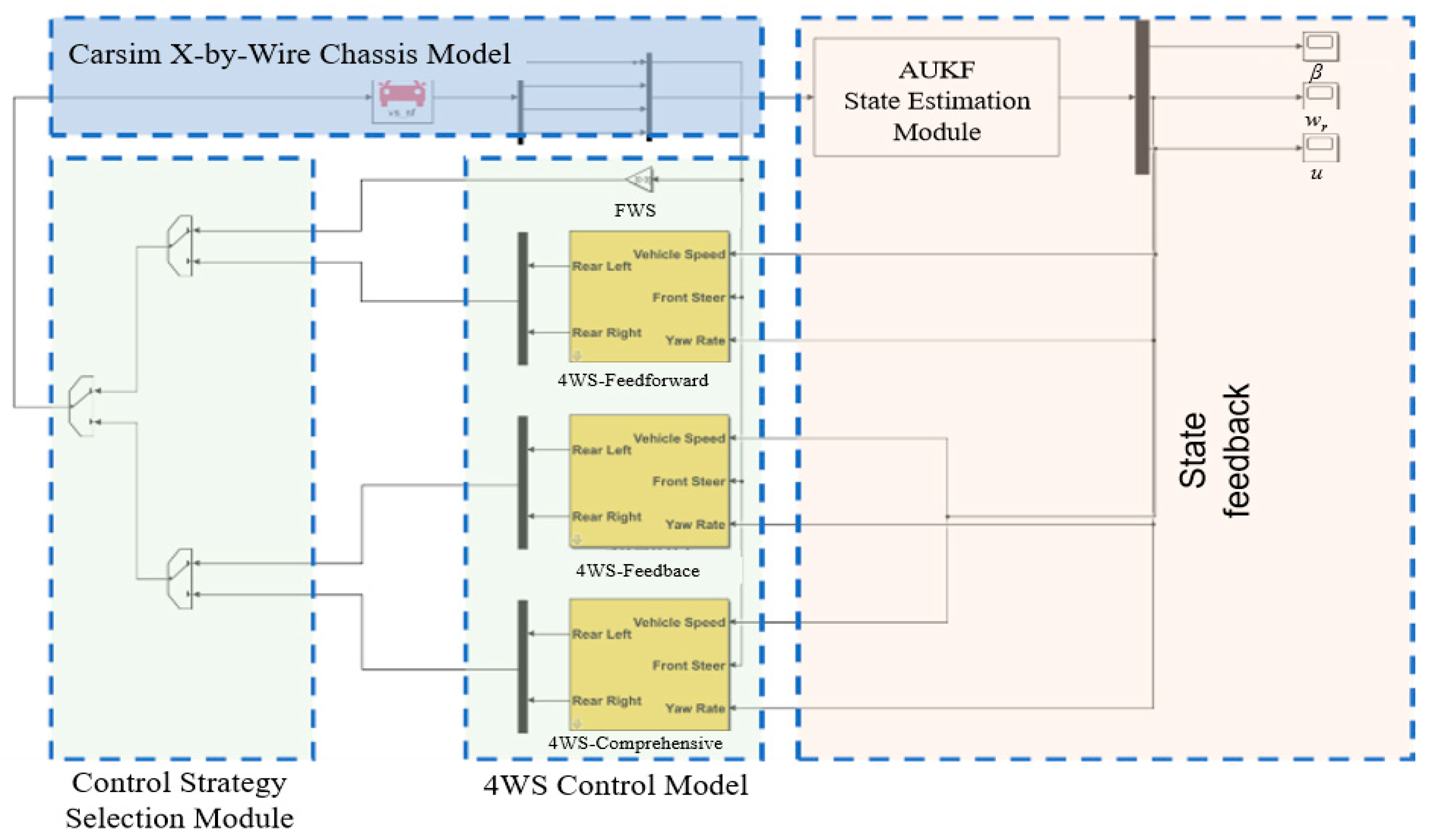 Classical 4WS control studies have primarily focused on improving high-speed stability and low-speed maneuverability, with feedback control often relying directly on high-precision yaw rate sensors and lateral acceleration sensors. For instance, the LQR-based control proposed by Pang et al. [