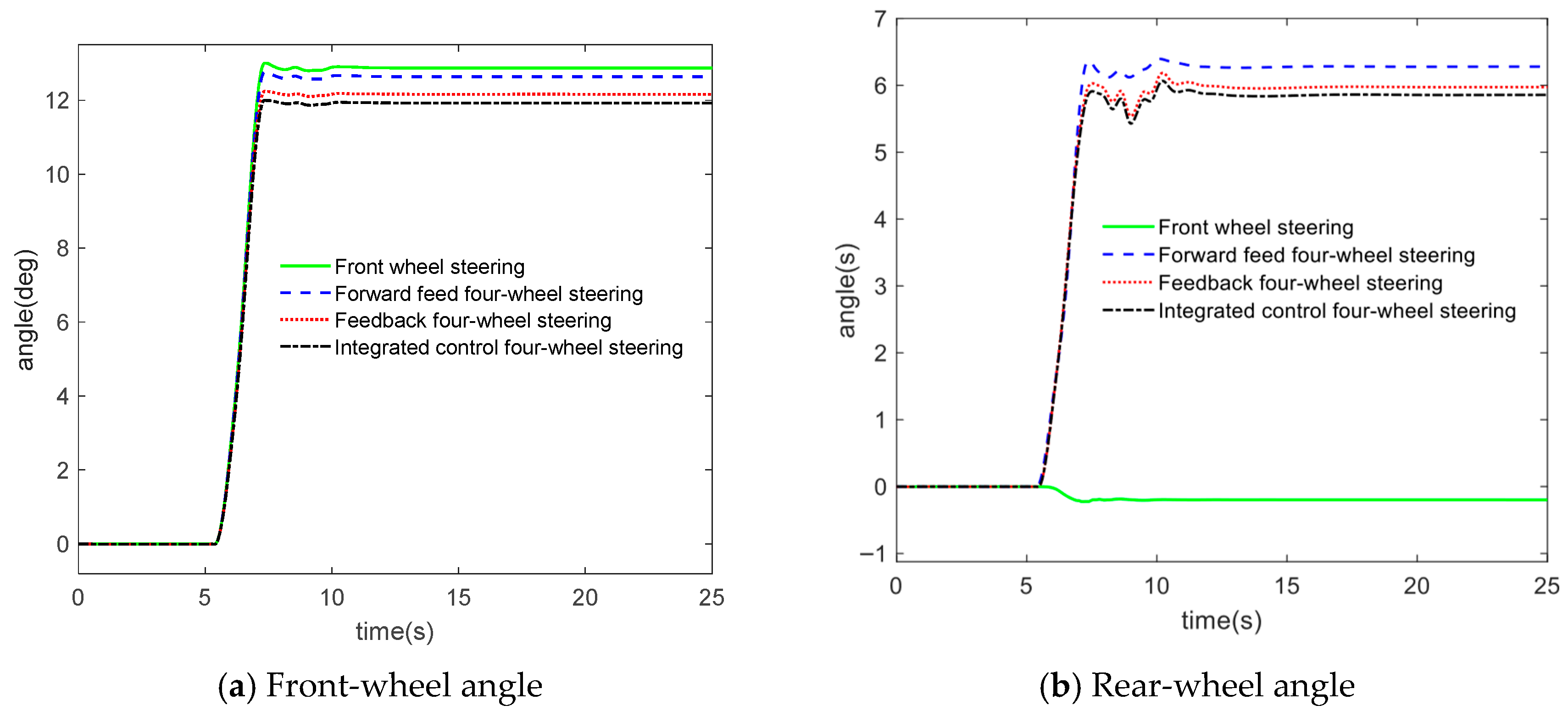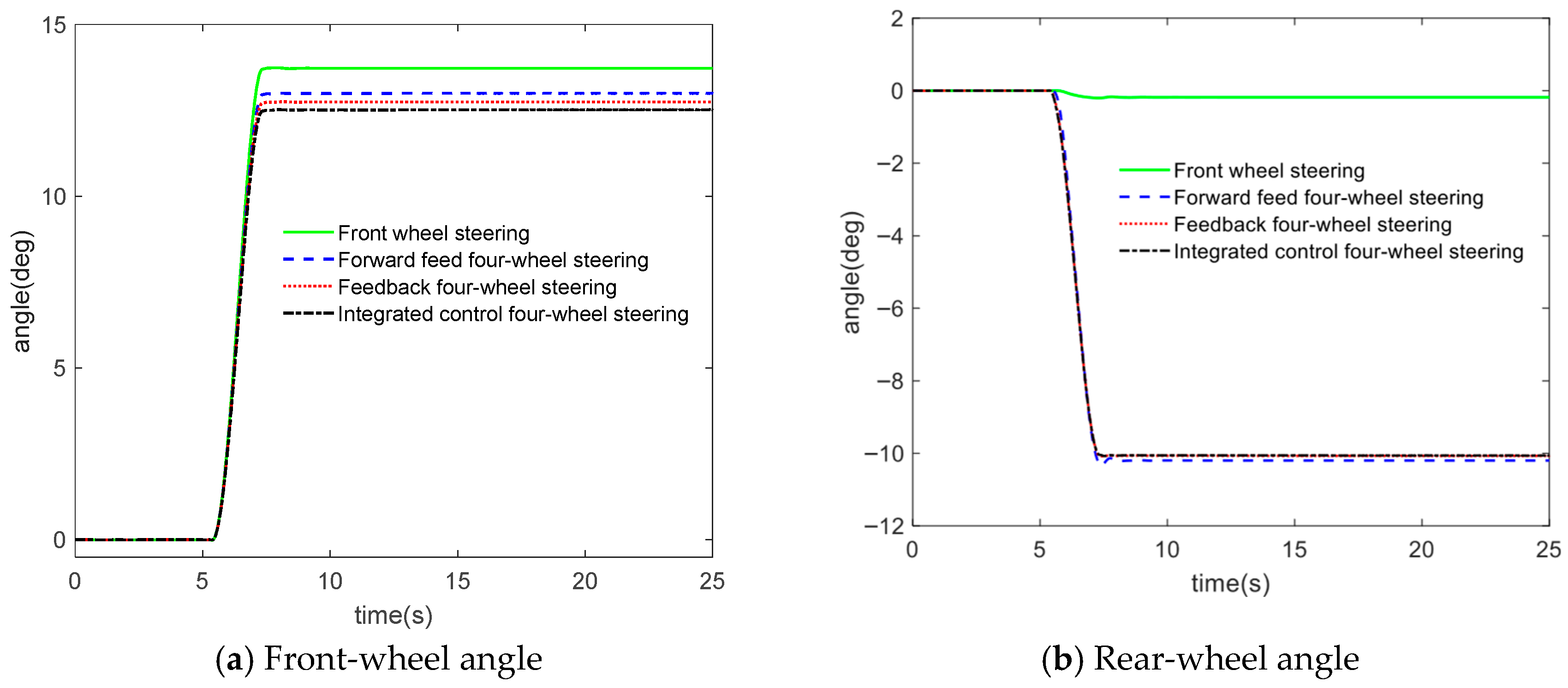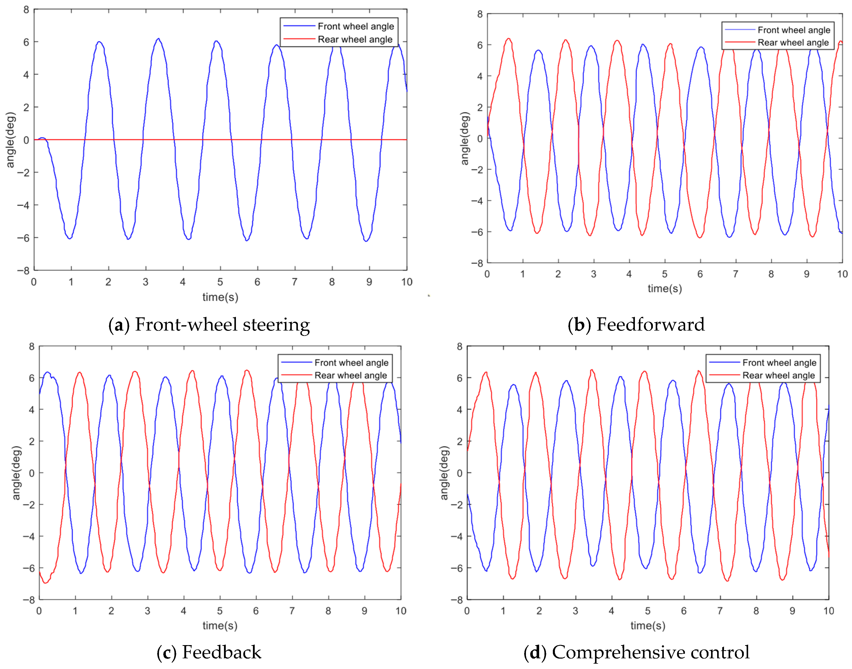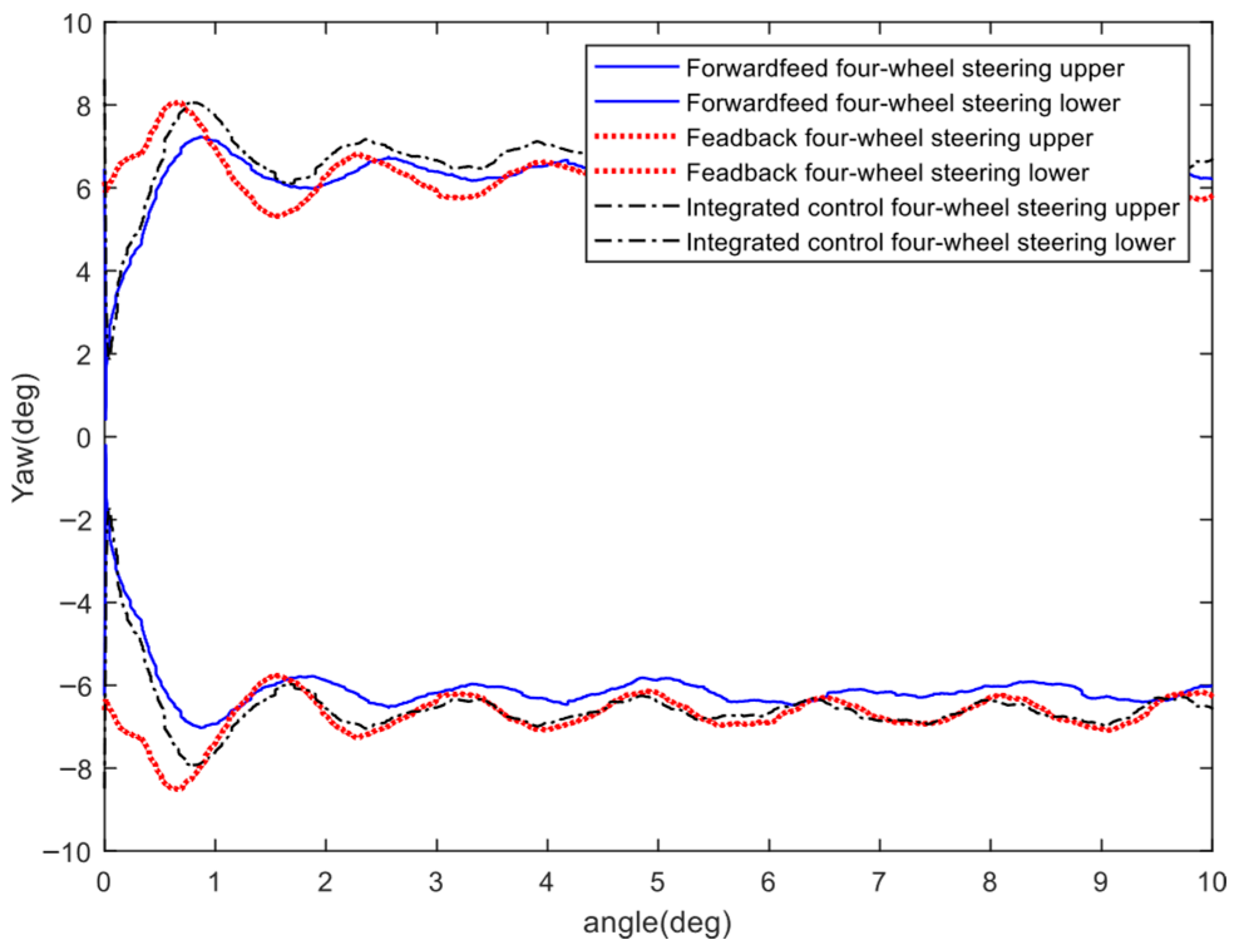In order to further improve the control performance of four-wheel steering, scholars have begun to adopt a feedforward and feedback control structure to improve the response speed, robustness, and anti-interference ability of the control.