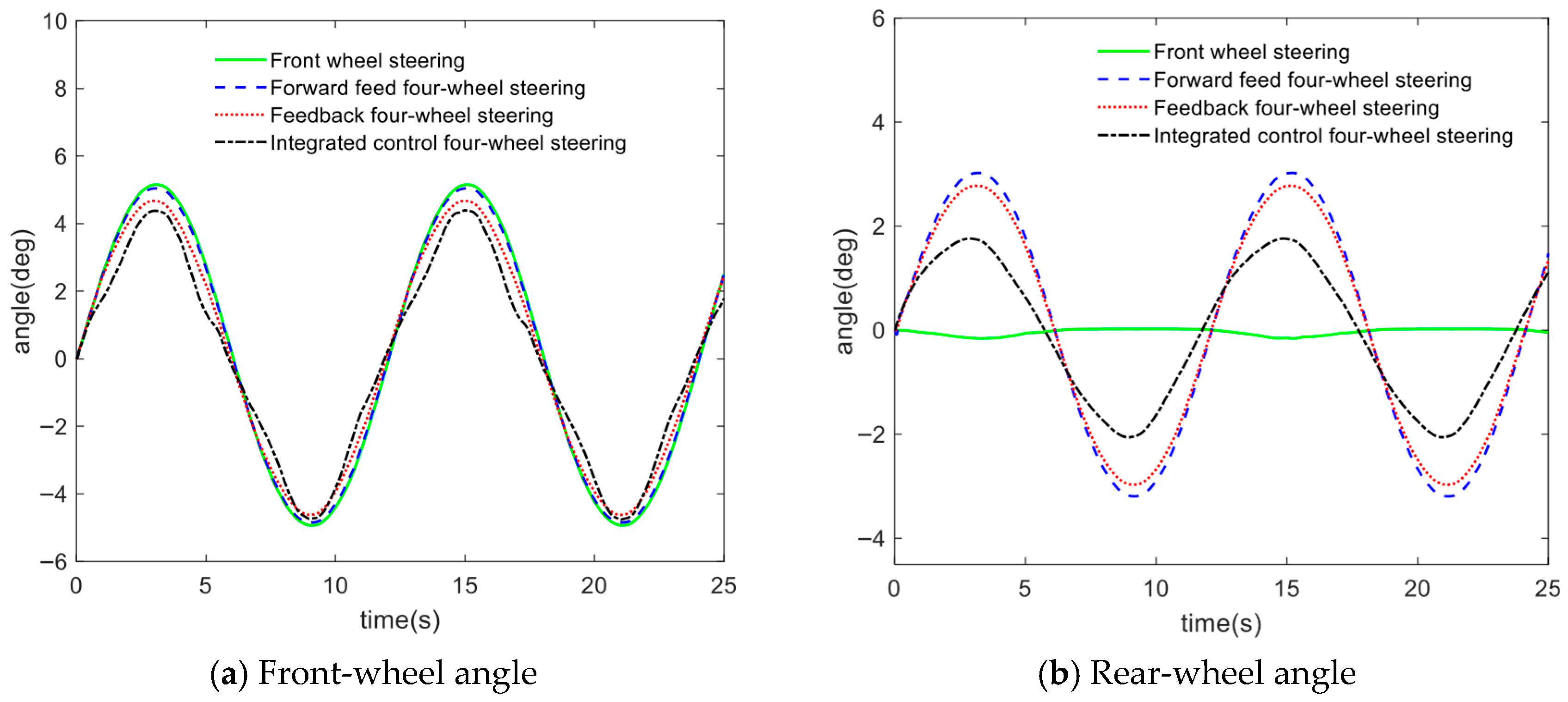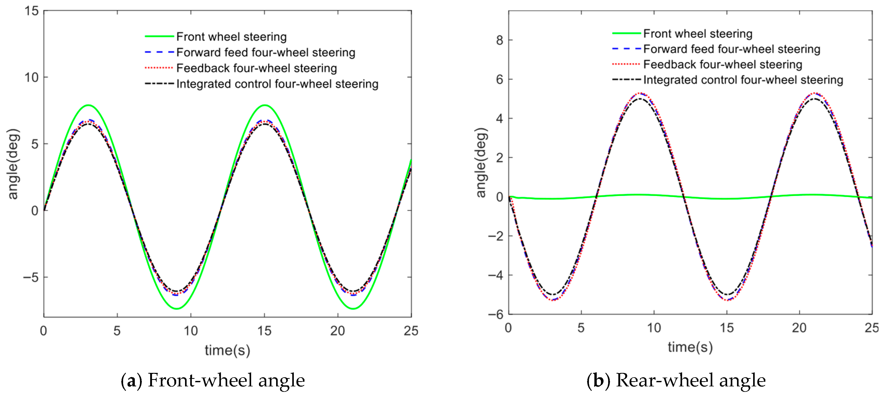 14]. Zhang et al. applied an optimal control methodology to the active 4WS system, successfully eliminating oscillations and overshoot in the system response. This approach effectively improved the vehicle’s transient response while ensuring driving stability at high speeds, maneuverability at low speeds, and smoothness during cornering [