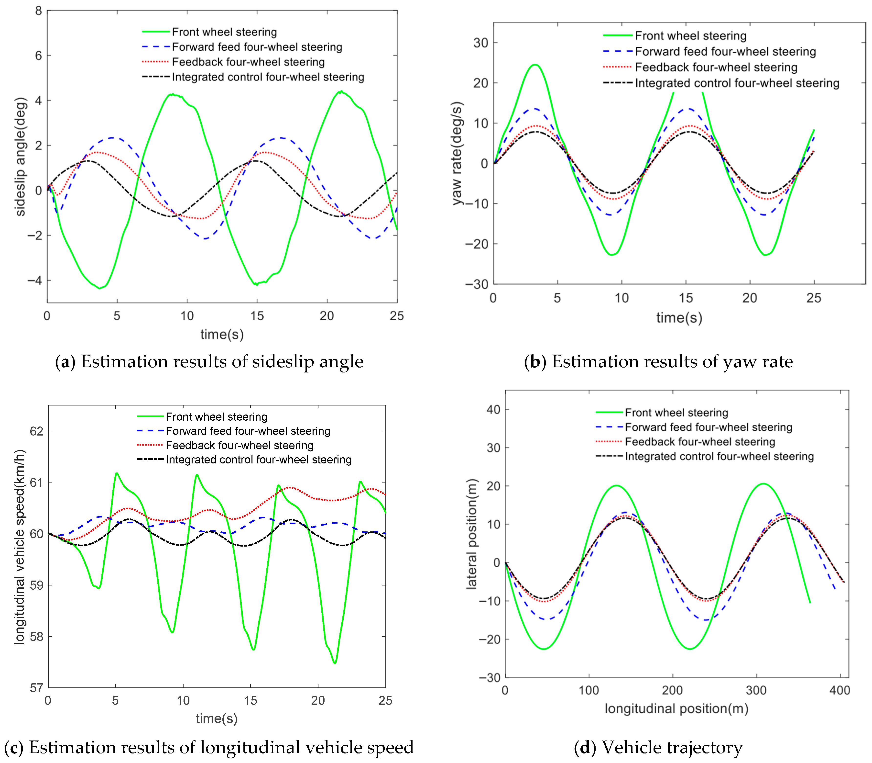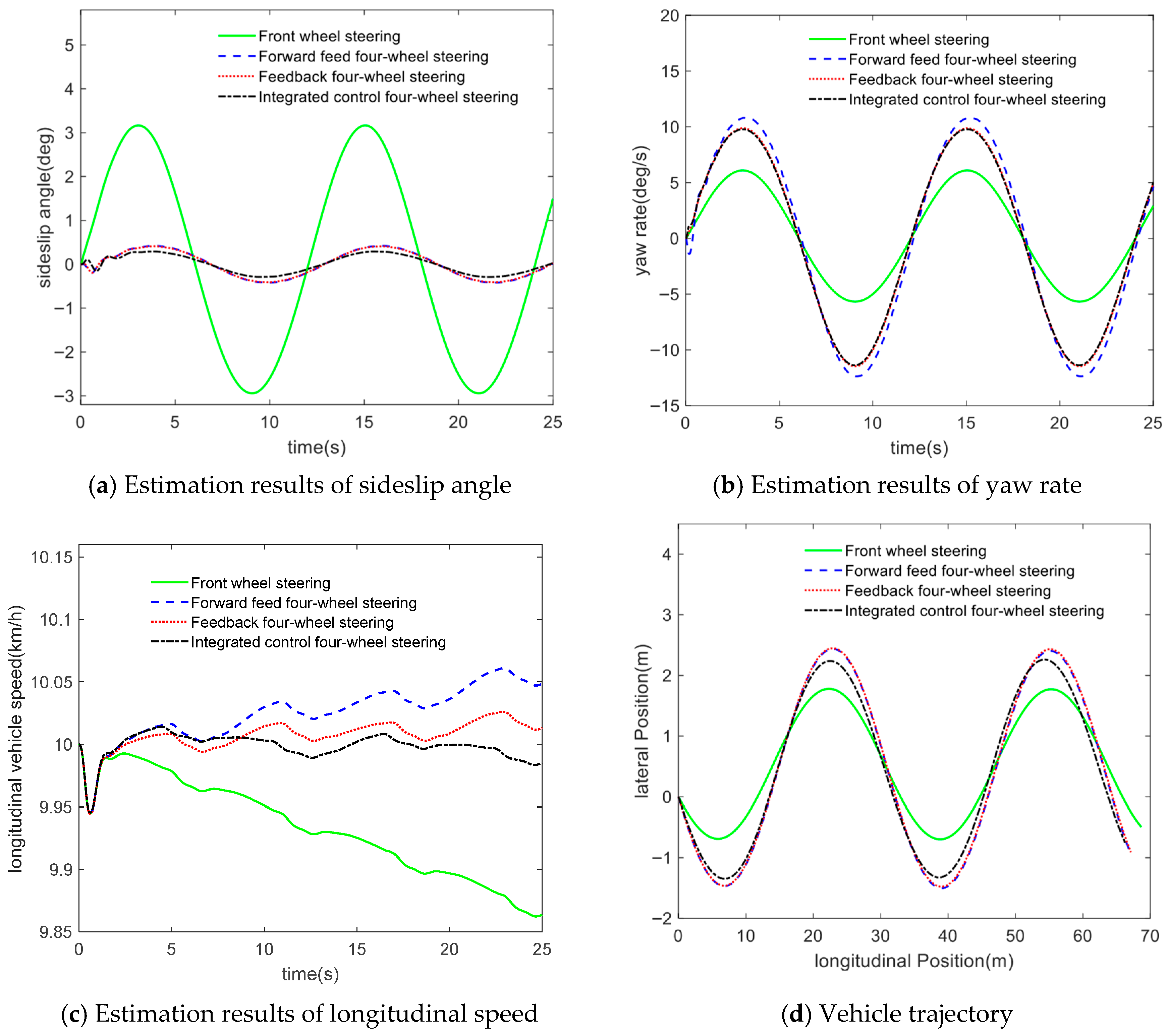 15]. Yu et al. proposed an integrated control strategy combining feedforward control, linear–quadratic optimal control, and disturbance observers for active four-wheel steering (4WS) systems. This approach effectively compensates for uncertainties, including external disturbances and higher-order unmodeled dynamics [