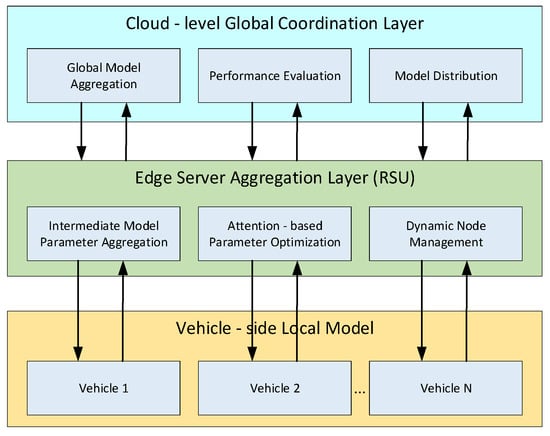 The system workflow follows the standard process of federated learning but incorporates attention mechanisms in both local training and global aggregation stages. A complete learning cycle includes the following steps: global model initialization, local vehicle training, model parameter upload, intermediate aggregation on edge servers, cloud-based global aggregation, model evaluation, and distribution [16]. This iterative process continues until the global model performance meets the preset standards or completes the specified aggregation rounds.