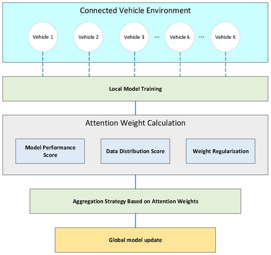In this study, as shown in Figure 5, attention weights are calculated based on two key factors: model performance and data distribution characteristics. Specifically, for each participating vehicle node, k, one calculates its attention weight, , as follows: