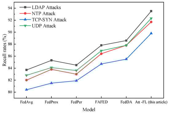 From the data in Figure 6, it can be seen that the Att-FL model proposed by the author achieved the highest accuracy in detecting all types of attacks. Compared to the traditional FedAvg algorithm, Att-FL improved the average accuracy by 8.8 percentage points; compared to the improved FedDA model, the average accuracy was improved by 4.2 percentage points. Especially when dealing with two common types of DDoS attacks in the Internet of Vehicles, LDAP attacks, and UDP attacks, the Att-FL model achieved accuracies of 94.8% and 94.0%, respectively, which are significantly better than those achieved by its comparative methods.