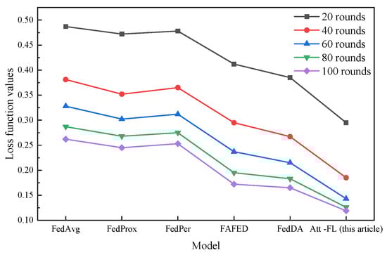 The comparison of loss function values also indicates that the Att-FL model has significant advantages. Under the same training epochs, the loss function value of this model is consistently lower than that of its comparison method [32]. Especially in the early stages of training (20 rounds), the loss value of the Att-FL model is 0.295, which is 39.4% lower than FedAvg’s 0.487. This indicates that the attention mechanism can effectively accelerate the model learning process in the early stages of training. As the training progressed, this advantage persisted, and after 100 rounds of training, the loss value of the Att-FL model decreased to 0.119, still 27.9% lower than the closest model, FedDA, at 0.165.