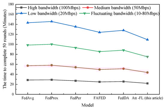 In order to further analyze the performance of the model in different communication environments, bandwidth limitation experiments were designed. Figure 12 shows a comparison of the time required for each model to complete 50 rounds of training under different bandwidth conditions.