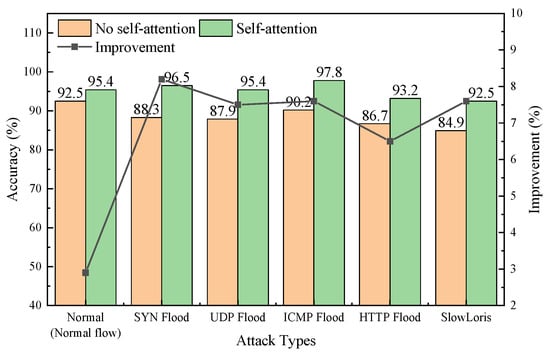As shown in Figure 14, the experimental results indicate that the self-attention mechanism at the feature level can significantly enhance the model’s ability to recognize key attack features. In all testing scenarios, the model incorporating self-attention mechanism improved the average detection accuracy by 6.8%, especially in the detection of complex attack types such as SYN Flood and UDP Flood, where the accuracy improvement was more significant, reaching 8.2% and 7.5%, respectively. This indicates that the self-attention mechanism can effectively capture unique feature patterns of different types of attacks, enhancing the model’s feature discrimination ability.