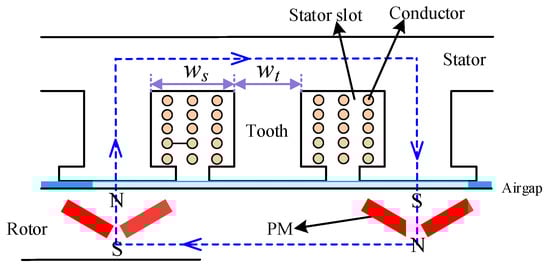 The electric loading of a permanent magnet machine is constrained by the stator winding temperature rise and the demagnetization withstand capability of the rotor permanent magnets, whereas the magnetic loading is limited by the magnetic saturation level in the stator and rotor cores. There exists a fundamental trade-off between the electric and magnetic loadings in the machine. Figure 3 illustrates a simplified no-load magnetic flux path in a V-shaped IPMSM. As shown, the flux generated by the permanent magnets crosses the air gap and enters the stator teeth. When the magnetomotive force produced by the magnets remains constant, the magnetic flux density in the stator teeth is governed by the degree of magnetic saturation in the teeth.
