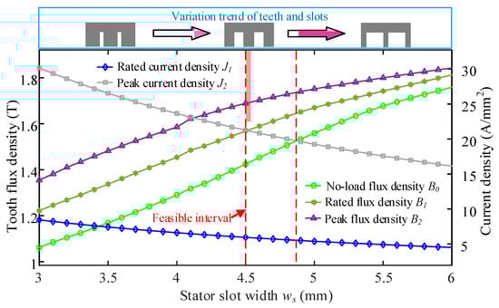 Assuming a constant stator slot height and sufficient flux-carrying capacity in the stator yoke, the stator slot width ws and tooth width wt exhibit a trade-off relationship in terms of their influence on magnetic and current density. A larger slot width ws increases the slot area, enabling the use of thicker conductors for a given number of turns, which corresponds to a lower current density, as depicted in Figure 4. Conversely, a larger tooth width wt allows more magnetic flux to pass through, leading to a reduction in magnetic flux density.