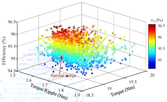 Figure 12 illustrates the trade-off relationships among torque, torque ripple, and efficiency. The point marked with a red pentagram indicates the optimal solution that balances all three optimization objectives. The output torque, torque ripple, and efficiency corresponding to this point represent the machine performance achieved under this optimal solution. The optimal values for the six design variables corresponding to the selected candidate point are as follows: O1 = 1.2 mm, r1 = 0.8 mm, Ang1 = 15°, Ang2 = 1.2°, Ang3 = 1.9°, and c1 = 0.35 mm.