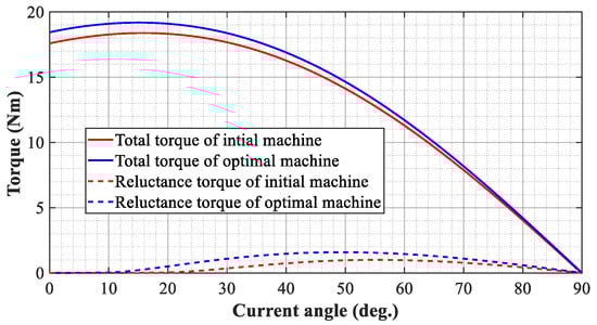 The rated operating condition represents the most frequent working state for the golf cart; therefore, particular attention must be paid to the machine’s torque and efficiency under this regime. It should be noted that the machine efficiency presented in this section is calculated based on electromagnetic losses. Specifically, it considers the measured stator copper losses and the core losses derived from finite-element analysis, while mechanical losses such as bearing friction and windage are excluded from this calculation. First, a comparative analysis of the output torque before and after optimization was conducted. Figure 15 shows the total output torque and reluctance torque of the machine at different current angles. It can be observed that after optimization, the maximum torque increases from 17.9 Nm to 19.2 Nm. The optimized machine not only delivers higher torque but also exhibits a greater reluctance torque component. This enhancement is primarily attributed to the increased saliency ratio, which rose from 2.03 to 2.24 after optimization, thereby strengthening the reluctance torque path. This indicates that for the same torque output, the optimized design requires less permanent magnet material, as quantified by a 4.75% reduction in magnet mass, which is beneficial for reducing overall machine cost.