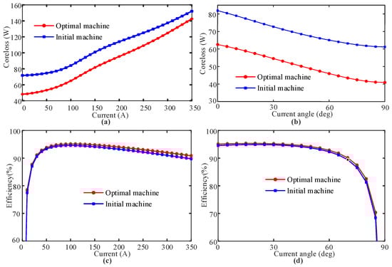 As shown in Figure 17b, the core loss increases with the input current, and the optimized machine exhibits lower core losses compared to the original design. Furthermore, within the current angle range of 0 to 90 degrees, the optimized machine consistently demonstrates reduced core losses, indicating lower high-speed losses during flux-weakening operation. From Figure 17c, it can be observed that as the current increases, the efficiency difference between the initial and optimized designs becomes more pronounced. At 350 A, the optimized machine achieves an efficiency improvement of 1.2%, demonstrating its ability to deliver higher efficiency during heavy-load operations such as vehicle hill climbing. Figure 17d further confirms that the optimized machine maintains its efficiency advantage under flux-weakening conditions as well.