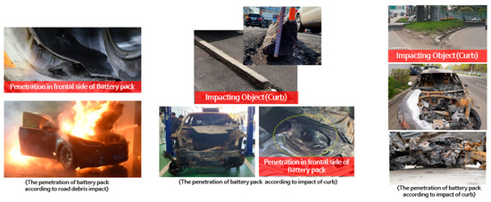 Three of the thirteen cases confirmed that the battery pack, mounted on the bottom of the EV, was directly impacted by road debris or curbs, leading to penetration and deformation of the battery pack. These cases demonstrated that EV fires can occur even in low-speed collisions (approximately 20 km/h or less) when the battery pack is directly impacted by road curbs or other road infrastructure.