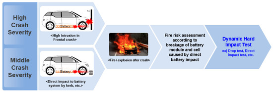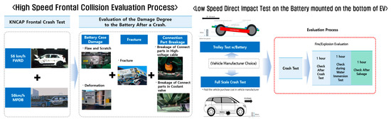 Current crash safety regulations for EVs are the same as those for vehicles using other fuels [5,6,7]. Additionally, EVs do not appear to be more vulnerable than vehicles using conventional fuels, according to the results of the Self-Certification Compliance Investigation and the New Car Assessment Program (KNCAP) conducted in Korea. However, the vulnerability of the battery has been highlighted in the undercarriage test, which simulates bottom collisions, as evidenced by data from the EVERSAFE European project [8]. Furthermore, there is a need for further research on post-collision fires in EVs, particularly concerning the direction of impact. Current crash test methods are limited in evaluating collision severity, as the impact location of the EV battery pack significantly influences the potential for fire and explosion [9,10,11,12,13].
