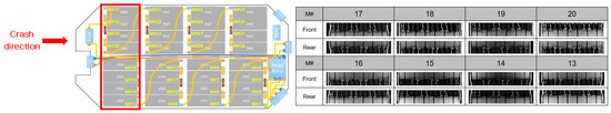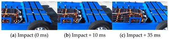As shown in Figure 19, the battery cells and modules were impacted by the internal frame of the battery pack due to the large deformation and fracture of the pack. Despite the severe damage, no fire or explosion occurred during the 12 h of post-crash monitoring, in contrast to Crash Mode 2.
