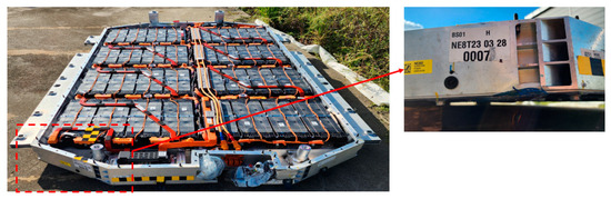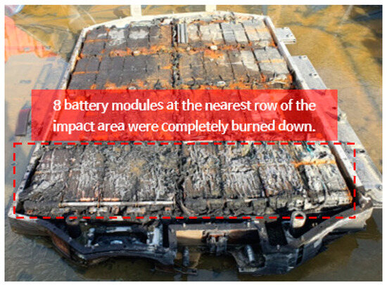 Second, a fire ignited in the tested battery approximately 2 h after the drop test, with only the eight battery modules adjacent to the impact area burning, as shown in Figure 11. This confirmed that the most vulnerable area of the battery in a direct impact is the location closest to the impact zone.