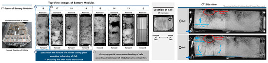 Third, a CT scan was performed on the fully burned modules adjacent to the impact surface of the battery pack, as shown in Figure 12. The CT scan revealed that the cells within the battery pack were damaged due to the fracture of the pack. It was confirmed that the cell in contact with the lateral support bar inside the battery pack also experienced movement or local compression deformation due to the impactor penetrating the pack. Based on the battery fire analysis, it was confirmed that the first fire occurred in battery module No. 16 in the front row, where the impactor collided. The impact was transmitted directly to the battery module through the penetration of the battery pack. The fire was likely caused by the anode material tearing first, followed by damage to the separator due to the tensile deformation of the cell during compressive deformation.