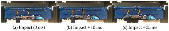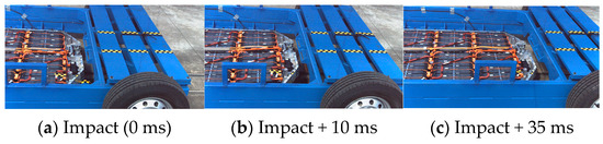 The crash mechanism of Crash Mode 4 was observed to resemble aspects of both Crash Modes 2 and 3. The first characteristic noted was the fracture and deformation of the front face of the battery pack, which caused the lateral support bar to impact the battery modules adjacent to the impact location, similar to Crash Mode 2. As a result, the deformation geometry of the frame inside the battery pack was found to be similar to or more severe than that observed in Crash Mode 2. The second characteristic was a bottom-scraping mechanism similar to Crash Mode 3, although it was more severe (see Figure 17 and Figure 18).