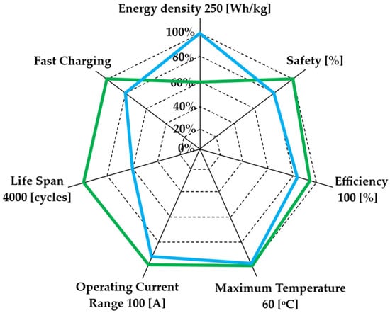 Spider figures of LFP and NMC batteries characteristics. The green line is related to the LFP battery cell while the blue one concerns the NMC battery cell.