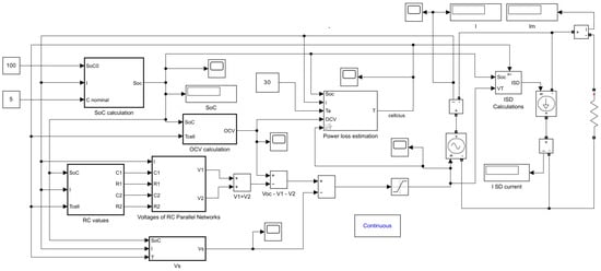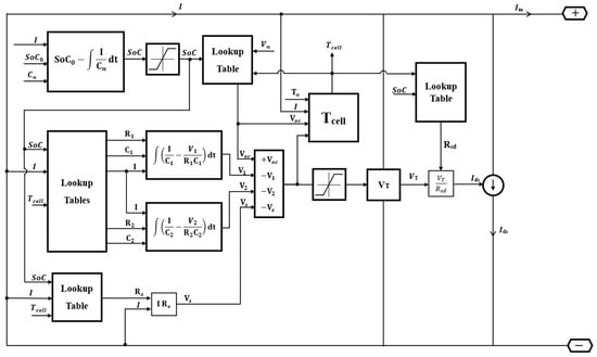 A number of studies have improved lithium batteries’ thermal stability to increase their life cycle. Optimizing electrodes, separators, and electrolytes, for example, is essential for better performance, stability, and reliability [24]. This research models and simulates LFP and NMC batteries using a simple electrothermal model based on current, temperature, and SoC. The system modeling of lithium battery cells is built based on the block diagram proposed by the author as shown in Figure 2. Based on the principle that feedback parameters depend on temperature, electrical parameters, and signals within a battery cell system of a second order, Figure 2 illustrates the entire system numerically in terms of measured responses to discharging currents, self-discharging currents, cell voltages, and cell temperatures. Nevertheless, the proposed research block diagram can be used with MATLAB/Simulink interfaces and manages the integration of these variables based on the data collected, which is reported in a specific lookup table for each electric variable, including internal series resistance, RC branches, and self-discharge resistance, as well as signals, such as open circuit voltage, SoC, current, and entropic coefficients.