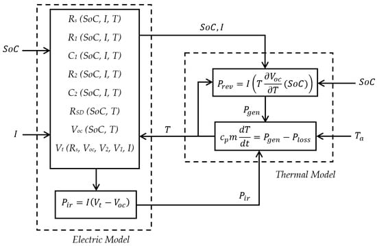 A more sophisticated system is required to provide accurate results. This system must account for all single pieces of information that may affect any part of the hall system. The general model described in this section describes the response signals for all types of lithium batteries. It integrates both electrical and thermal components during charging and discharging. Figure 3 illustrates the coupling between the electric and thermal models. Further, it describes how the electrical and thermal submodels of a cell are interconnected internally through heat transfer, with power generated based on the chemistry of the cell as represented by the entropic coefficient and the electrical components that are affected. Among the inputs are the current flowing through each battery cell, the SoC, and the ambient temperature.