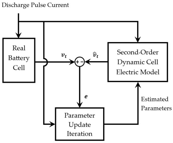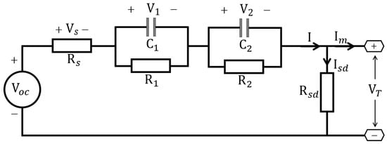 Based on the previous equation, the polarization voltages V1 and V2 can be written in forms presented in Equations (5) and (6), respectively, which can be calculated depending on RC pairs as a function of state of charge, current, and temperature.