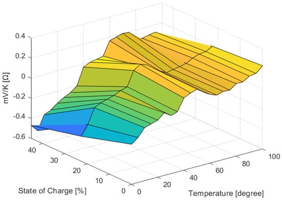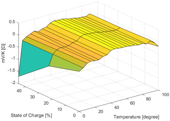 Figure 6 presents the relationship between the entropic coefficient of an LFP battery vs. SoC and temperature. NMC cells, as shown in the figure, have an entropic coefficient between −0.47 and 0.21 mV/K, which indicates that the entropic coefficient varies greatly according to the chemistry inside them during charging and discharging cycles.