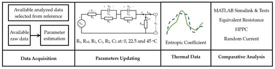 As a result of chemical reactions, the battery’s behavior differs from moment to moment, resulting in different measured values for SoC, temperature, and voltage. Furthermore, the electrothermal model parameters are affected by instantaneous operating conditions such as current, cell temperature, and system configuration. Depending on the temperature range at which the cell operates, there are three main temperature breakpoints denoted by 0, 22.5, and 45 °C. In accordance with the available data, in the range of discharge current, the LFP has five breakpoints of 0, 10, 20, 30, 40, and 50 A. In addition, the LFP has three breakpoints, 0, 10, and 30 A. The third factor determining the values of these elements in electrical models is the SoC. This typically has 20 breakpoints for LFP batteries and 10 breakpoints according to the data available from 0 to 100%. In the research methodology introduced, hysteresis during charging and discharging is ignored since this paper focuses on the discharging behavior of the concerned batteries based on data from previous studies. Furthermore, it needs to be studied deeply in order to obtain more accurate results since battery aging also influences the whole process. The assumption was made to focus on the primary thermal and electrical behaviors of the LFP and NMC cells, since incorporating hysteresis would have added significant complexity to the system dynamics without necessarily providing additional insight at this point in time. By ignoring hysteresis, certain deviations may occur between the model predictions and the actual cell behavior, particularly under conditions in which hysteresis significantly affects energy efficiency and thermal response. As an example, hysteresis affects the estimated parameters associated with the electrical model, such as internal resistance and RC branches. Moreover, ignoring hysteresis may affect SoC estimation precision as it also affects terminal voltage. Additionally, energy losses which are not accounted for in the model may result in underestimating total energy inefficiency, altering the temperature profiles, especially in cases of frequent cycling, which could result in a slight discrepancy in the thermal model results due to the entropic coefficient. In this simulation, the charge state is measured using the current Coulomb method. This is under the assumption that there are no errors related to build up and inrush currents. Data acquisition is carefully selected based on previous experiments. In the absence of available data, some parameters are estimated and approximate values are chosen to cover the entire study range. This is based on lithium cells’ logic concerning the correlation between current and temperature. Figure 7 illustrates the research methodology proposed in this work.