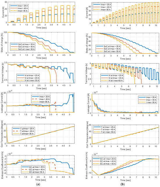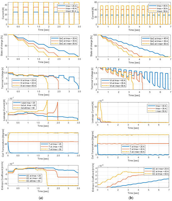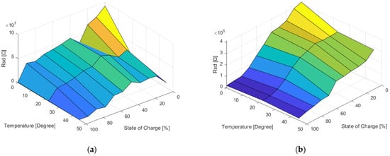 Temperature changes affect lithium batteries’ self-discharge resistance, which may decrease at higher temperatures and increase at lower temperatures depending on their rate of discharge during storage. Consequently, the leakage current for unrelaxed battery cells during discharge is affected by the SoC and temperature [38,39,40]. However, it can be presented as in Figure 11a,b as a surface plot since it depends on both temperature and SoC.