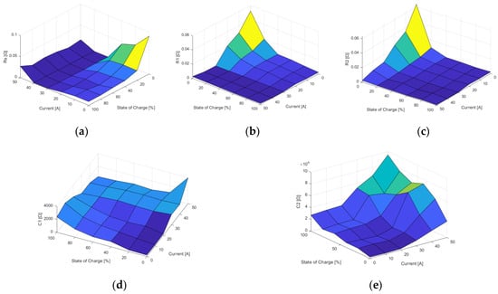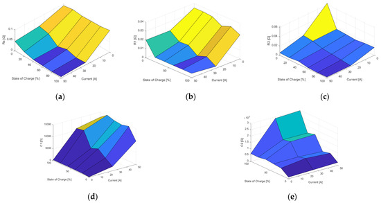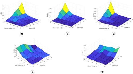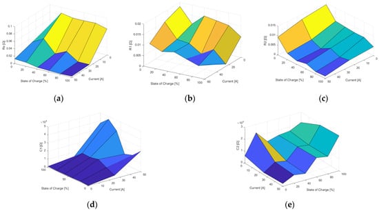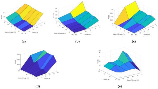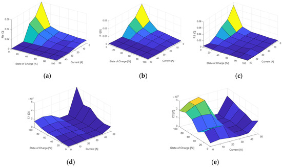According to previous experiments and research conducted on NMC battery cells, RC parameters consisting of the second order can be presented in Figure 15, Figure 16 and Figure 17 as surface plots [33,36,37,52,53,54,55,56,57,58,59,60,61,62,63].